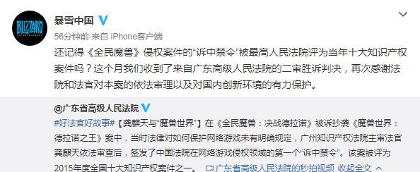 暴雪中国昨天在微博上宣布,《全民魔兽》侵权案二审胜诉。 暴雪中国表示,在这个月收到了来自广东高级人民法院的二审胜诉判决,并对法院以及法官对本案的依法审理以及对国内创新环境的有力保护进行感谢。 2015年暴雪和网易公司将国内三家公司告上法庭,诉其发行运营的手游《全民魔兽:决战德拉诺》主权侵权以及不正当竞争。 2016年8月的时候,广州知识产权法院曾就此案作出判决,裁定暴雪娱乐及网易获胜。 |