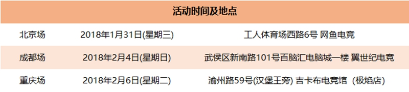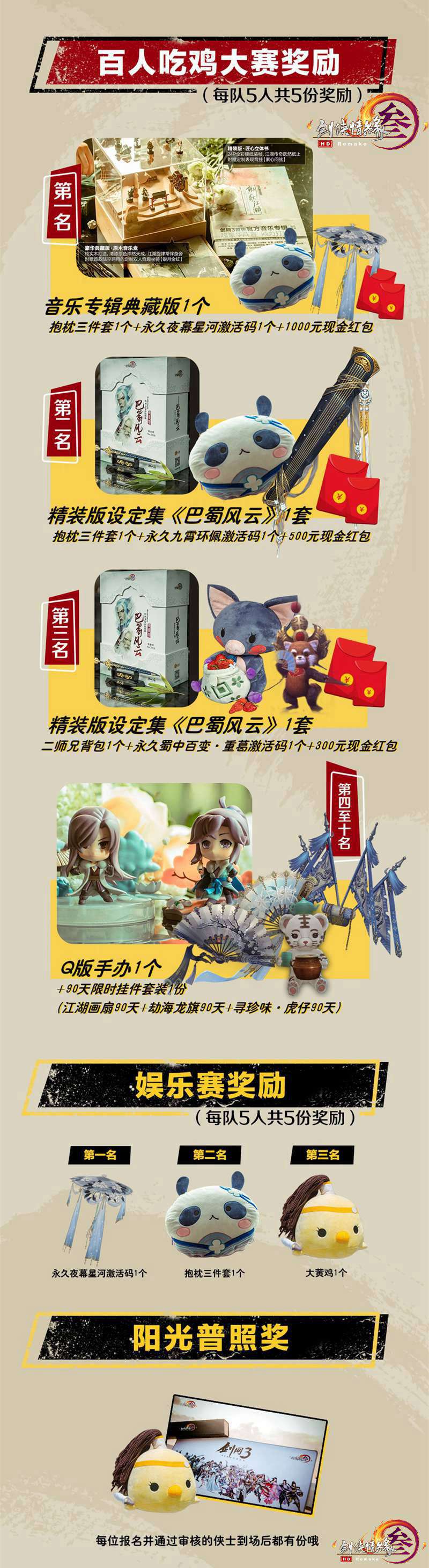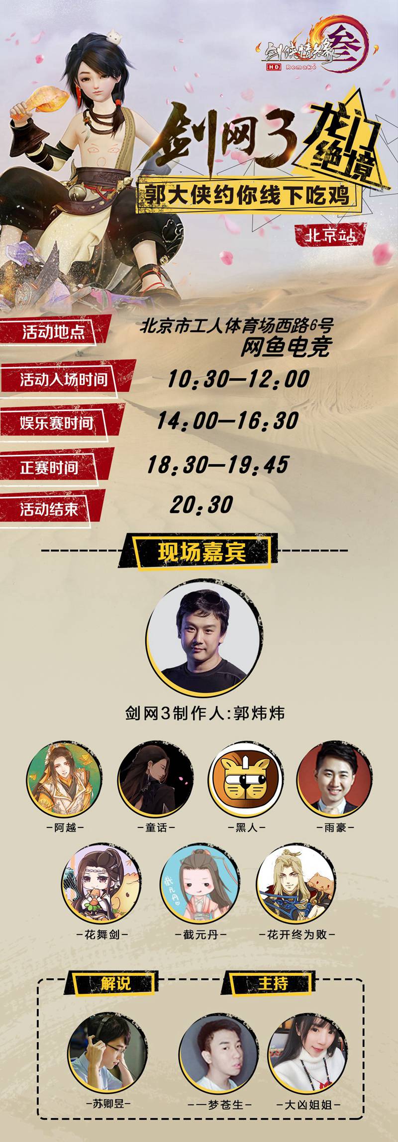 《剑网3》龙门绝境玩法自上线以来,深受广大侠士喜爱,一时间可谓是高手辈出。时逢年底,龙门王者的巅峰之战《剑网3》线下吃鸡赛也将重磅出击!本次比赛设有北京、成都、重庆三个赛点,《剑网3》制作人郭炜炜也将现身活动现场与诸位大侠们千里相聚,共同吃鸡! 本次活动将由一梦苍生和大凶姐姐主持,苏卿昱解说,活动现场不仅将有众多COSER与各位玩家互动,还有诸位大家耳熟能详的主播阿越、童话、黑人、雨豪、花舞剑、截元丹、花开终为败等也将在现场亮相。郭大侠也将亲自带队参赛,想要与郭大侠一较高下的话,可不要错过机会哦! 活动现场不仅美食小吃管饱,每位报名通过审核到场参与的侠士,还将有大黄鸡玩偶和《剑网3》定制鼠标垫先行奉上。在活动中取得名次的参赛队伍,更有机会获得巴蜀风云精装设定集、音乐专辑典藏版等精美实体周边;而永久夜幕星河、九霄环佩、蜀中百变?重葛等珍稀虚拟奖品也在等待各位侠士前来认领哦!所有奖品均可通过本次线下活动中的娱乐赛和吃鸡大赛中赢得!价值数十万的海量好礼等你来拿! 活动报名地址: https://www.wjx.top/m/20377544.aspx 《剑网3》官网 jx3.xoyo.com |