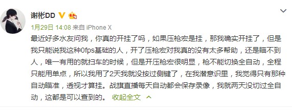 随着《绝地求生》的火爆而来的开挂问题已经让众多普通玩家深恶痛绝,人人喊打,而一些深陷开挂疑云的主播或选手都希望能够通过各种手段证明自己,不过近日DOTA职业选手@谢彬DD主动承认开了压枪宏,他也自嘲道,即使开了宏,也没有什么帮助,还是瞄不到人。 @谢彬DD先是表示如果压枪宏是挂,那他确实开挂了,但对OFPS基础的他来说,开了压枪宏也没啥帮助,依旧瞄不准,用了2天就没按过侧键了,DD解释道,在潜意识里,自动瞄准、透视才能算是挂。 在后续微博中,DD再次承认自己开了就是开了,不需要洗地,对于外挂他也十分痛恨,在知道这也属于挂后,这个游戏基本不玩了,而且他也不是吃鸡主播,没靠这游戏获什么利。 对于DD的勇于承认的态度,玩家的留言没有太过激烈, 还有人为DD的微博做出了“翻译”:“1.我用过压枪宏,共计两天,此后再也没用过。 2.我很菜,用宏也打不死人。 3.我现在依旧很菜,但我坚决抵制宏或挂。” 有玩家问DD在“红包局”中开过挂没有,DD回复道,红包局他输了1100。 |