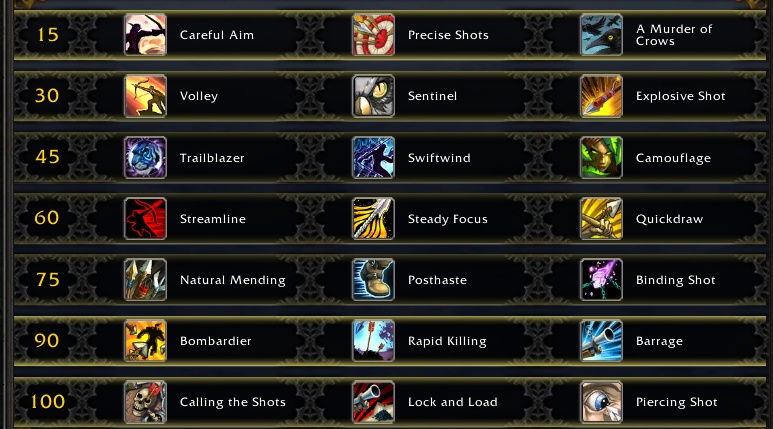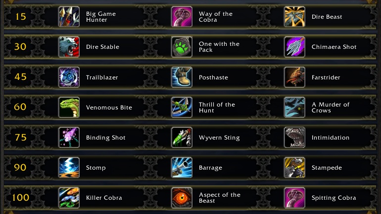 近日,《魔兽世界》8.0争霸艾泽拉斯资料片已经在测试服上线测试,下面就为大家带来猎人天赋系统一览。 兽王 第一层:凶猛狂暴成为默认技能,凶猛野兽成为天赋 第二层:原兽栏与兽群移动到此 第三层:不变 第四层: 左:眼镜蛇射击减少红人1秒cd; 中:凶猛狂暴使暴击+3%,持续8秒,叠加3层; 右:黑鸦 第五层:不变 第六层: 左:践踏 中:弹幕 右:群兽奔腾 第七层:喷毒眼镜蛇取代原群兽奔腾 凶猛狂暴的改动非常不合理,凶猛野兽与眼镜蛇之道为同层天赋。 射击 射击机制已改得亲妈不认,回能技能有死而复生稳固射击和急速射击,以及大难不死的多重射击。耗能技能有传统的瞄准射击和新增的快速射击。奥术射击?标记射击?不存在的。孤狼变成智能被动,不带宠物就加攻。 另外还有玄学的猎人印记,天赋里到处都是相关效果,然而技能书里并没有这玩意。目前推测是瞄准射击会触发猎人标记,内置XX秒cd。 第一层: 新版精确瞄准,只作用于瞄准射击; 瞄准射击激活猎人印记时,能耗减50%; 黑鸦 第二层: 多重射击引发箭雨; 新版哨兵,瞄准射击为目标10码内所有敌人激活猎人印记; 爆炸射击 第三层: 原开拓者; 瞄准射击减少10秒豹裙cd; 原伪装 第四层: 急速射击续2秒; 稳固使下一发稳固读条-0.25秒,叠加4层; 释放猎人印记后,20秒内下三发快速射击不耗能 第五层: 意气风发+20%回复(至50%……); 原迅捷如风; 束缚击 我们先暂停一下,再讲一个机制变动。新版本射击猎释放多重射击后,瞄准射击和急速射击可以向目标附近敌人弹射,类似原灵巧射击 第六层: 增加瞄准射击和急速射击弹射伤害; 瞄准射击和急速射击每次弹射减少猎人标记1秒; 弹幕 第七层: 快速射击减少猎人标记2秒cd; 荷枪实弹; 穿刺射击 总体来讲,尽管猎人标记没有实装,射击猎伤害已经强的可怕。 生存 生存的伤害技能砍得只剩击杀命令、猛禽一击、手雷和毒蛇钉刺。 第一层: 鱼叉回40能,且击杀目标后刷新鱼叉 将击杀命令强化成侧翼打击 第二层: 手雷充能+1 毒蛇钉刺奇美拉化 屠戮 第三层: 开拓者 迅捷如风 伪装 第四层: 类似D3的增痛宝石,击杀命令使目标流血,流血效果提高猎人和宠物攻速 钢夹子 黑鸦 第五层: 胁迫、束缚击 第六层: 击杀命令增加猛禽15%伤害,叠3层 猫鼬 极地手雷,单体伤害+减速 第七层: 猛禽击中宠物目标时,给雄鹰守护续一秒 鱼叉加暴击,后跳加急速,二者存一,持续15秒 战轮,玩过dota里的兽王吗? 精简了一些技能,可玩性提高了 |