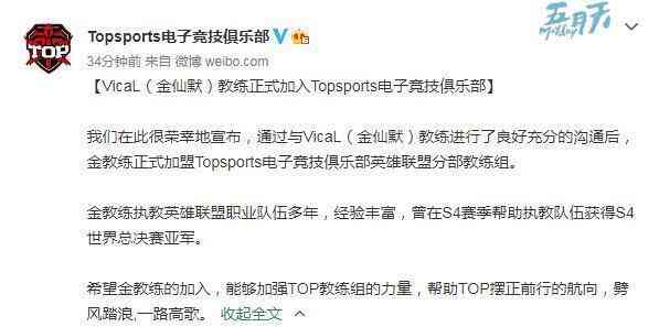 今日,Topsports电子竞技俱乐部再次宣布了一则人事变消息,金仙默教练加入TOP俱乐部教练组。 原文如下: 我们在此很荣幸地宣布,通过与VicaL(金仙默)教练进行了良好充分的沟通后,金教练正式加盟Topsports电子竞技俱乐部英雄联盟分部教练组。 金教练执教英雄联盟职业队伍多年,经验丰富,曾在S4赛季帮助执教队伍获得S4世界总决赛亚军。 在微博的最后,Topsports电子竞技俱乐部希望在金仙默教练能够帮助下,加强实力,在LPL走动额更远,站的更高。 金仙默教练本人的履历也很丰富,是《星际争霸》职业玩家,是KeSpa认证的专业裁判。在2014年5月来到LPL执教SHR皇族俱乐部之前,一直担任着KT旗下KTA和KTB两队的总教练。而在S4世界总决赛中,金仙默教练更是带领着皇族战队蝉联了世界亚军。 经过简单的介绍可以了解到金仙默教练和刚加入TOP的Corn选手一样都是出生子皇族一系,老相识了,这样无疑会使二人尽快的投入到训练中。也希望TOP能在接下来的额春季赛常规中取得好成绩。 |
