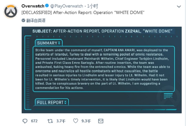 守望先锋官方发文:疑似公布新英雄及新地图 今日,《守望先锋》官方发布了一条游戏任务报告,行动代号为“白色穹顶”。在该任务的综述中除了安娜、莱因哈特和托比昂之外,还有一个叫埃姆雷·萨里奥卢(Emre Sarioglu)的家伙。