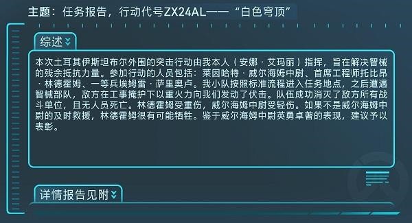 本次土耳其伊斯坦布尔外围的突击行动由我本人(安娜·艾玛丽)指挥,旨在解决智械的残余抵抗力量。参加行动的人员包括:莱因哈特·威尔海姆中尉、首席工程师托比昂·林德霍姆、一等兵埃姆雷·萨里奥卢。我小队按照标准流程进入任务地点,之后遭遇智械部队,地方在工事掩护下以重火力向我们发动了伏击。队伍成功消灭了敌方所有战斗单位,且无人员死亡。林德霍姆受重伤,威尔海姆中尉受轻伤。如果不是威尔海姆中尉的及时救援,林德霍姆有可能牺牲。鉴于威尔海姆中尉英勇卓著的表现,建议予以表彰。