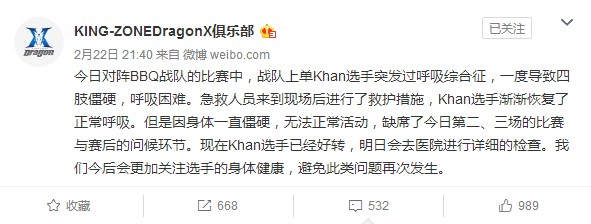 昨日,在《英雄联盟》韩国LCK职业联赛上,KZ战队对阵BBQ战队的比赛中,被玩家誉为“世界第一上单”的Khan选手突发过呼吸综合征,一度导致四肢僵硬,呼吸困难,难以继续比赛,KZ战队的七连胜也遭到终结。 随后急救人员来到现场后对Khan进行了救护措施,Khan选手渐渐恢复了正常呼吸,但是因身体一直僵硬,无法正常活动,缺席了第二、三场的比赛与赛后的问候环节。 目前,KZ俱乐部官方发微博表示,现在Khan选手已经好转,今日会到医院进行详细的检查,今后也会更加关注选手的身体健康,避免此类问题再次发生。 |