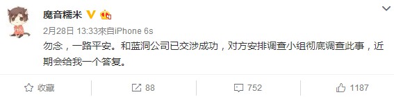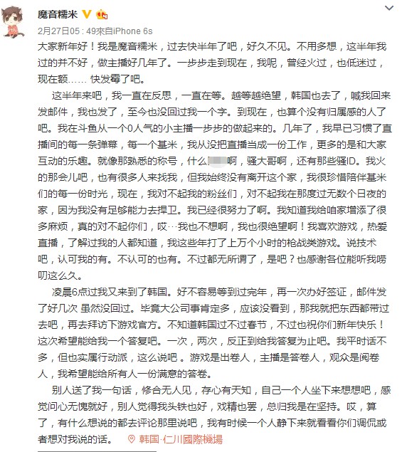 还记得因为外挂问题前往韩国要证明自己清白的《绝地求生》主播魔音糯米么?在上一次赴韩求证无果而终后,魔音糯米在微博上沉寂了很久,而近日他再度发声,事情似乎有了新一步的进展。 许久没有在微博上出现的魔音糯米先是于2月27日表示自己再度来到了韩国,拜访官方,希望这次能够给他一个答复。 上一次,从去韩国到给网友回应,魔音糯米让大家等了近两个月的时间,质疑之声也水涨船高,而这次围观的网友终于不用再像上一次一样等待那么久的下文,在他表示自己去往韩国的第二天,也就是2月28日,魔音糯米称自己已经交涉成功了。 @魔音糯米:“勿念,一路平安。和蓝洞公司已交涉成功,对方安排调查小组彻底调查此事,近期会给我一个答复。 ” 在经历了斗鱼封禁、上一次韩国之行无果而终后,魔音糯米这次同蓝洞的交涉成功会为整件事情带来怎样的新进展,另外最近被玩家挖出来的,关于自称为中国区负责人金秀焕前女友的相关爆料又是否属实?敬请关注后续报道。 |