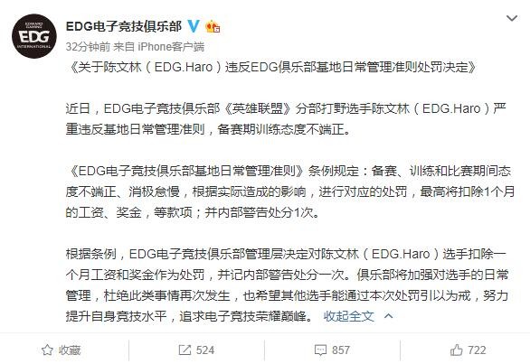 EDG电子竞技俱乐部今天在微博上公布了对旗下《英雄联盟》分部队员陈文林(EDG.Haro)的处罚决定,称其严重违反基地日常管理准则,备赛期训练态度不端正,并将根据条例,对该选手扣除一个月工资和奖金作为处罚,并记内部警告处分一次。 据了解,Haro在比赛当天的凌晨仍然没有休息,仍然在和一名女性好友进行双排,而到了正式比赛中的表现也不如人意,引发了俱乐部粉丝的强烈不满,同时也引起了俱乐部方面的重视。 EDG俱乐部官方声明如下: 《关于陈文林(EDG.Haro)违反EDG俱乐部基地日常管理准则处罚决定》 近日,EDG电子竞技俱乐部《英雄联盟》分部打野选手陈文林(EDG.Haro)严重违反基地日常管理准则,备赛期训练态度不端正。 《EDG电子竞技俱乐部基地日常管理准则》条例规定:备赛、训练和比赛期间态度不端正、消极怠慢,根据实际造成的影响,进行对应的处罚,最高将扣除1个月的工资、奖金,等款项;并内部警告处分1次。 根据条例,EDG电子竞技俱乐部管理层决定对陈文林(EDG.Haro)选手扣除一个月工资和奖金作为处罚,并记内部警告处分一次。俱乐部将加强对选手的日常管理,杜绝此类事情再次发生,也希望其他选手能通过本次处罚引以为戒,努力提升自身竞技水平,追求电子竞技荣耀巅峰。 |