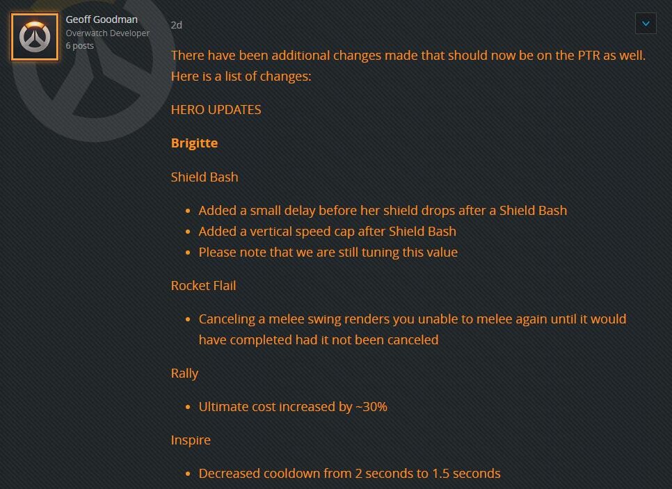 《守望先锋》的新英雄布丽吉塔由于目前的表现过于强势,尤其是对于使用猎空的玩家们来说,简直是噩梦,所以她也终于迎来了在测试服的首次削弱,主要调整了在完全取消火箭连枷挥动之前无法再次挥击,同时大招“集结号角”的消耗提升30%。 游戏的更新日志如下: 能量盾击: 在使用能量盾击后,放下护盾前,增加了一小段延迟; 增加了使用能量盾击后的垂直速度限制; 请注意我们仍然在调整这一技能的伤害; 火箭连枷: 取消火箭连枷挥动之前无法再次挥击; 集结号角: 大招消耗增加了30%; 恢复包: 冷却时间从2秒减少至1.5秒 了解更多相关信息,请前往http://game.yzz.cn/html/info-1916.html |