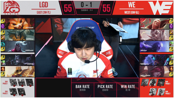 本场比赛LGD战队选择让Fdy担任首发ADC,没有让Imp登场。从两队的阵容来看,WE战队选择了一个前中期的团战型阵容,上单的亡灵勇士在前中期发育成型后,在坦度和输出方面都很强,打野的虚空遁地兽也能够在刷野和GANK方面给队伍带来帮助,中单的魔蛇之拥在中后期的团战中输出很高,双人路选择了“凤凰传奇”这个进攻性十分强大的组合,这个阵容在中期的团战输出十分爆炸,而LGD战队则选择了一个中后期的阵容,上单的猩红收割者和ADC的皮城女警这两个英雄需要发育到35分钟之后才能打出优势,打野的凛冬之怒在前期的带节奏能力很强,而且在中后期的坦度也很高,中单的沙漠皇帝在对线方面就属于版本强势英雄,在中路占据优势后,能够给队伍上下两路带来持续性的帮助,双人路选择了皮城女警加上牛头酋长的发育型组合。本场比赛LGD战队能否顶住WE战队前期的攻势,将成为本场比赛的关键。 比赛开始后,WE战队的中单魔蛇之拥就成功在线上压制了LGD战队的中单沙漠皇帝。随后双方的打野不约而同的来到中路GANK,配合己方中单魔蛇之拥一言不合直接开打,最终WE战队成功打了波0换1后,击杀了沙漠皇帝,拿到第一滴血!随后WE战队的打野虚空遁地兽配合己方辅助幻翎洛赶到中路GANK,三人直接越塔,成功击杀了沙漠皇帝,但LGD战队的上野辅三人赶到中路包夹,成功将虚空遁地兽和幻翎洛击杀!紧接着WE战队的上野赶到下路GANK,配合己方双人路成功击杀了牛头酋长,并且拔掉了LGD战队的下路一塔,拿到了防御塔的一血!随后WE战队的双人路换线至上路推进,LGD战队的双人路也换线至上路推进。紧接着两队中野再次中路遭遇,WE战队再次击杀了沙漠皇帝!同时LGD战队刷掉了峡谷先锋,而WE战队的双人路上路推进,成功拔掉了LGD战队的上路一塔。LGD战队中路召唤出峡谷先锋后,WE战队直接将其清理掉。比赛进行到18分30秒,人头数WE 4-2 LGD,防御塔数WE 2-0 LGD,小龙数WE 0-0 LGD,经济方面WE战队领先LGD战队2800元。 WE战队在占据优势后,刷掉了第一条小龙(水龙)。紧接着WE战队下路推进,破掉了LGD战队的下路二塔后,WE战队直接开团,成功打了波0换2后,WE战队破掉了LGD战队的下路高地塔和下路高地水晶。随后WE战队中路推进,成功破掉了LGD战队的中路一塔,WE战队的中野利用队友的牵制,成功偷刷掉了大龙!紧接着WE战队利用大龙BUFF中路推进,成功拔掉了LGD战队的中路二塔,第二条小龙(土龙)刷新后,WE战队再次将其刷掉,WE战队刷掉了LGD战队野区中的全部资源后,WE战队再次中路和上路推进,成功拔掉了LGD战队的上路二塔后,WE战队中路抓住机会直接开团,成功击杀了沙漠皇帝后,WE战队中路推进,破掉了LGD战队的三路高地水晶后回城补给。WE战队再次上线后,直接中路推进,发现了LGD战队后,WE战队直接开团,成功打了波1换3后,WE战队一波带走了LGD战队,拿下了本轮系列赛第一场比赛的胜利!恭喜WE战队先下一城!WE在战队的中单选手Xiye凭借魔蛇之拥的出色发挥,成功帮助队伍拿下本场比赛的胜利后,成功夺得了本场比赛的MVP!恭喜Xiye!