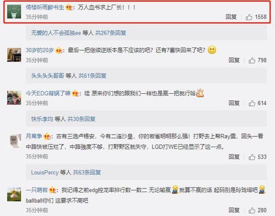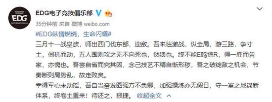 在结束的LPL春季赛RNG与EDG的世纪大战中,在厂长继续选择休战的情况下,双方大战三场,最终RNG凭借全队的出色发挥成功击败EDG豪取五连胜,恭喜RNG! 在握手的环节中,Uzi也是与Meiko来了一波深情的拥抱,毕竟作为全明星的下路组合两人曾一起战斗过,如今两人虽然成功对手,但是情义还在。 EDG战队在失利之后,官博发布了一则文言文微博秀了一波,微博原文表示: 三月十一战皇族,师出西门伐东部,迎敌。吾来往激战,纵全局,游三路,争寸土,伺机而动,五人围则攻之无不向死也,然溃也。终不能E鸣惊R,得一胜而告家,亦愧也。吾尝自省而究其因,念己技艺不精自惭形秽,吾之破绽敌之机会,节奏断则局势乱,故走败矣。 幸得军心未动摇,吾自当奋发图强方不负卿,加强操练亦无假日,守一室之地谋新体系,终卷土重来!待还之,报捷。 但是对此,网友则是纷纷请求EDG核心灵魂人物厂长上场,而该网友的这一条万人血书求上厂长在短短的时间里也是获得了上千粉丝的点赞。看来厂长的回归也是众望所归的了。 网友除了纷纷要求厂长上场救主之外,也是对教练的BP进行了一番吐槽了。教练Joker也是皮了一下:醉卧沙厂君莫笑,古来征战几人回。 不得不说的是,在这次的对决中,卡萨已经很好的融入了RNG的团队中去并且也是成功掌控了比赛的节奏,不知道此时香锅看了这一幕之后心里是否已经感到凉凉了?厂长又将在什么时候迎来复出首战呢? |