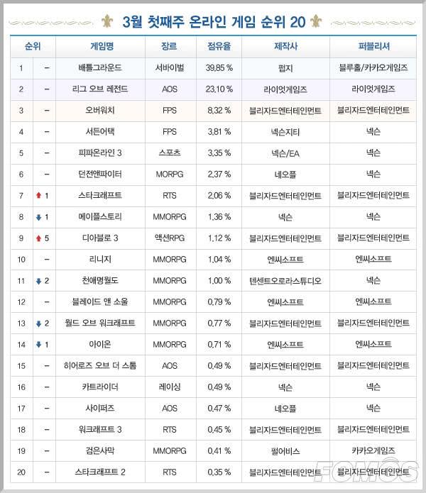 [ 摘要 ]由于开学季和韩国三一节的到来,3月第一周的韩游榜有多款MMORPG网游排名出现下滑,《绝地求生》连续16周位居排行榜第一。 3月第一周韩游排行榜,由于开学季和韩国三一节的到来,多款MMORPG网游呈现出排名下滑的趋势。