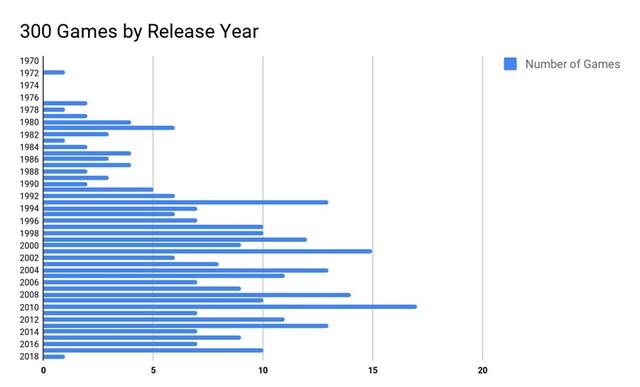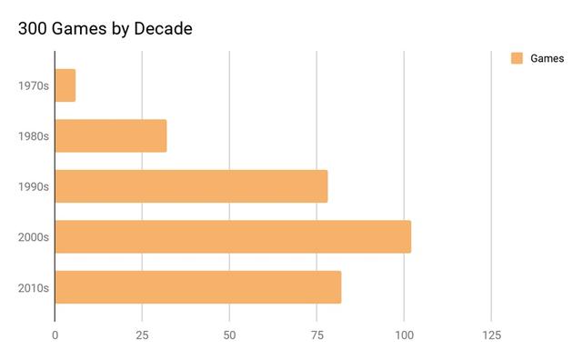 这300款游戏按发售年份和年代划分,从1970年到2018年期间,2010年发售的游戏上榜最多,其次是2001年。按年代来看的话,榜单中有超过100款游戏是在二十一世纪前十年发售。