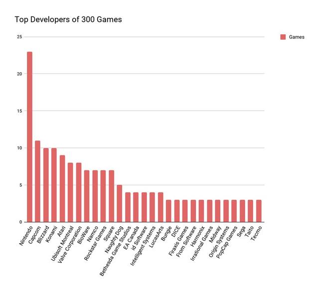 从游戏开发商来看,作品数上榜最多的开发商是任天堂,该公司有近25款游戏上榜,接下来则分别是卡普空、暴雪、科乐美、雅达利、育碧蒙特利尔工作室、Valve、BioWare、南梦宫及Rockstar等。