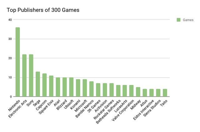 从游戏发行商来看,作品数上榜最多的发行商依然是任天堂,该公司发行的作品中有近40款游戏上榜,接下来则分别是EA、索尼、世嘉、卡普空、Square Enix、雅达利、暴雪、育碧及科乐美等。