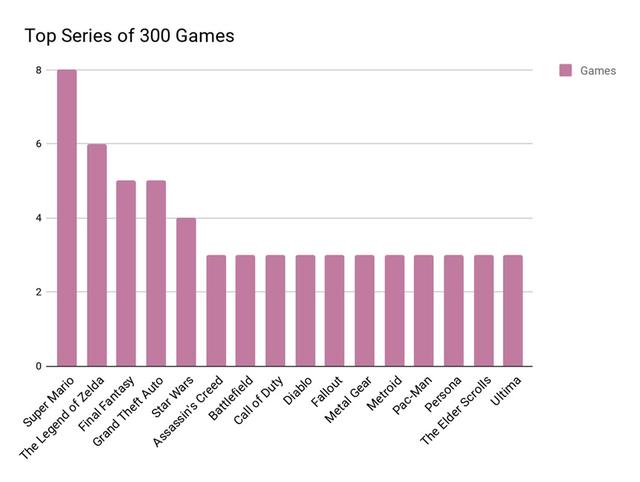 按游戏系列划分的话,《超级马里奥》系列有八款作品上榜,其次是《塞尔达传说》系列,有六款作品上榜,另外《最终幻想》和《侠盗车手》系列也都有五款作品上榜。