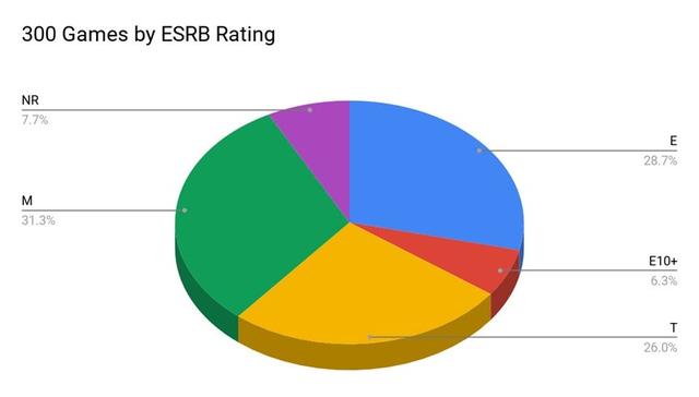 按照娱乐软件分级委员会(ESRB)的评级,上榜游戏中有31.3%属于M级(适合成年人,17岁及以上),28.7%属于E级(适合所有人),26.0%属于T级(适合青少年,13岁及以上)。
