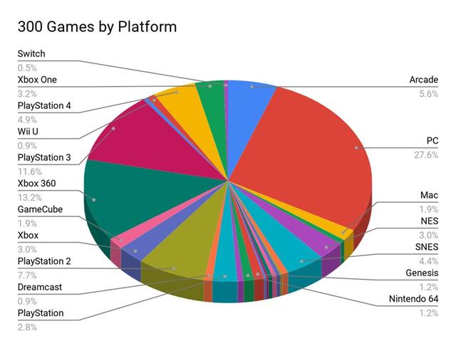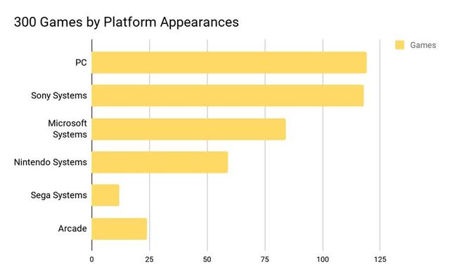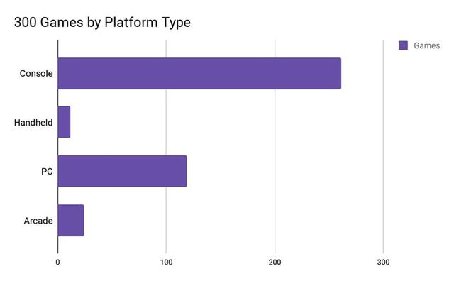 如果单看平台类型的话,这300款游戏中超过250款来自主机平台,来自PC平台的也超过了100款,其他的则分别来自街机和手持游戏设备。另外,来自主机平台的游戏中,登陆索尼主机的数量最多,其次分别是微软、任天堂和世嘉。