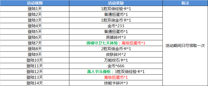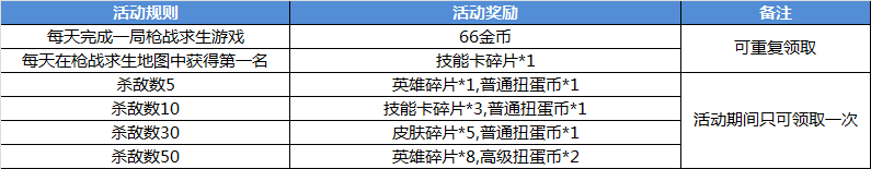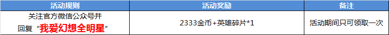 时间真的过得很快呢,三月份即将接近尾声,2018年已经过去三分之一啦!接下来是当然愚人节的到来了,但是这个愚人节绝对不愚人哦!《幻想全明星》今日推出愚人节狂欢季活动,关注官方微信“幻想全明星”(微信直接搜索“幻想全明星”即可),并回复“我爱幻想全明星”七个字,均可获得2333金币和英雄碎片哦!还有其他超值奖励,一起来看看吧! 活动一:关注官方微信活动 活动时间:3月20日-4月3日 活动规则及奖励: 关注官方微信“幻想全明星”(微信直接搜索“幻想全明星”即可),并回复“我爱幻想全明星”七个字,均可获得以下奖励,活动期间仅可领取一次。 活动二:累计登陆活动 活动时间:3月20日-4月3日 活动规则及奖励: 连续登陆可领取相对应活动奖励,活动期间仅可领取一次。 活动三:在线奖励活动 活动时间:3月20日-4月3日 活动规则及奖励: 活动期间内,凡在晚上21:00准时在线的用户即可领取233金币,在晚上20:30至22:30时间段内完成任意一场有效局均可普通扭蛋币一个。 若在晚上20:30至22:30时间段内完成任意一场有效局,并且21:00准时在线的玩家,均可领取233金和普通扭蛋币一个。 活动期间内,活动奖励每天仅可领取一次。 活动四:累计在线活动 活动时间:3月20日-4月3日 活动规则及奖励: 累计游戏在线时长达到后即可领取相应活动奖励,活动期间每天仅可领取一次。 活动五:10V10活动 活动时间:3月20日-4月3日 活动规则及奖励: 完成以下对应的10V10游戏模式对局场次,均可领取相应活动奖励,活动期间仅可领取一次。 活动六:5v5活动(仅限人人匹配模式) 活动时间:3月20日-4月3日 活动规则及奖励: 完成以下对应的5V5游戏模式对局场次,均可领取相应活动奖励,活动期间仅可领取一次。 活动七:枪战求生活动 活动时间:3月20日-4月3日 活动规则及奖励: 每天完成一局枪战求生对局均可获得66金币,若在枪战求生模式中获得第一名可获得技能卡碎片一个,此奖励在活动期间可重复领取。 完成以下对应的枪战求生游戏模式击杀次数,均可领取相应活动奖励,活动期间仅可领取一次。 活动八人族无敌活动 活动时间:3月20日-4月3日 活动规则及奖励: 每完成一场人族无敌对局,即可获得英雄碎片一个,此奖励在活动期间可重复领取。 完成以下对应的人族无敌模式场次,均可领取相应活动奖励,活动期间仅可领取一次。 活动九:大乱斗活动(仅限人人匹配模式) 活动时间:3月20日-4月3日 活动规则及奖励: 每完成一场都市大乱斗对局,即可获得皮肤碎片一个,此奖励在活动期间可重复领取。 完成以下对应的都市大乱斗游戏模式对局场次,均可领取相应活动奖励,活动期间仅可领取一次。 活动十:空岛战神活动 活动时间:3月20日-4月3日 活动规则及奖励: 完成以下活动任务领取对应活动奖励,活动期间仅可领取一次。 即日起关注《幻想全明星》官方微信、官方微博(微信微博直接搜索“幻想全明星”即可)还有机会免费获得当周新英雄新皮肤。官方微信每周一、周三还有免费“每周礼包”和“应援物资”领取(发送“每周礼包”或“应援物资”至公众号即可)。 全球独有10v10和200人枪战求生的二次元动漫大乱斗端游《幻想全明星》已经正式开启约会测试!现在注册登陆还送15英雄10款皮肤10000金币!《幻想全明星》更有枪战求生、玩家自制人族无敌地图现已正式上线,满足你所有需求,现在各种二次元萌妹子陪你一起打游戏,心动不如行动,快来《幻想全明星》享受这独一无二的浪漫约会吧! 了解更多相关信息,请前往http://game.yzz.cn/html/info-2374.html |