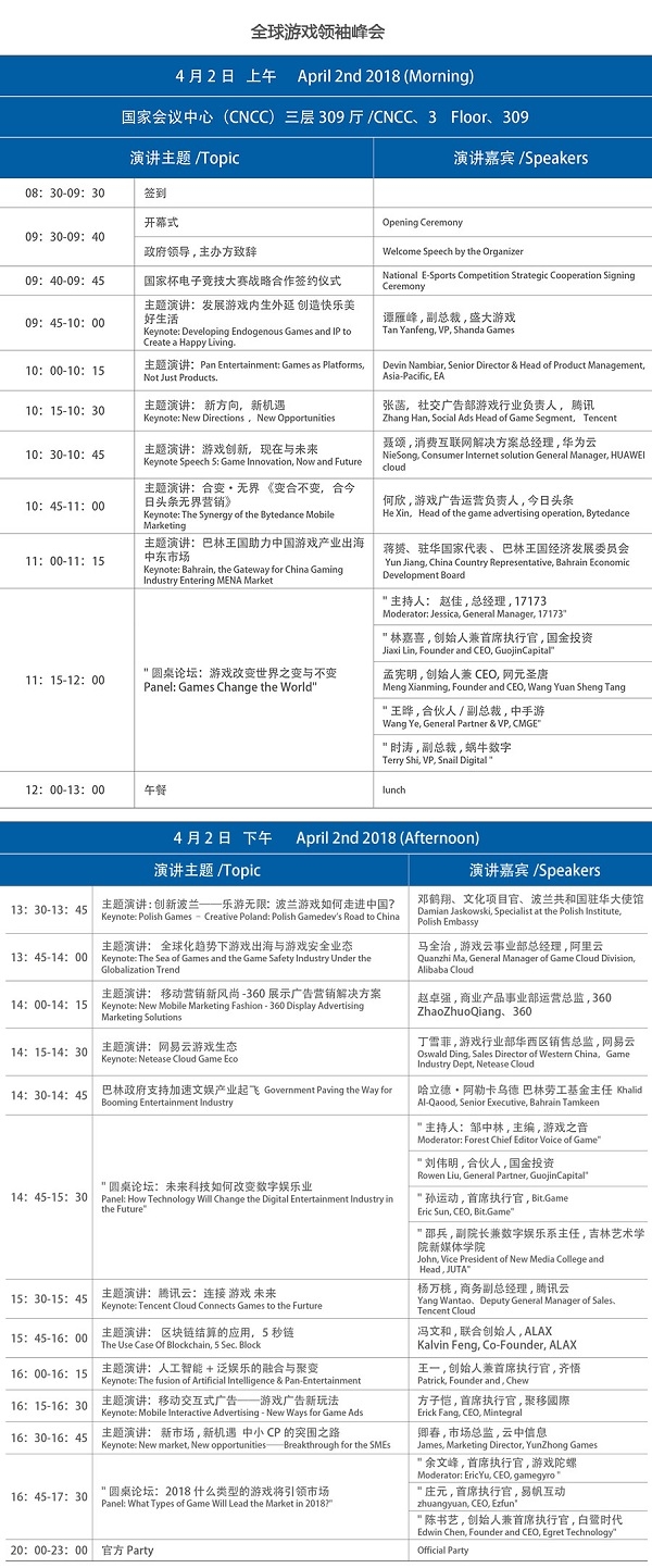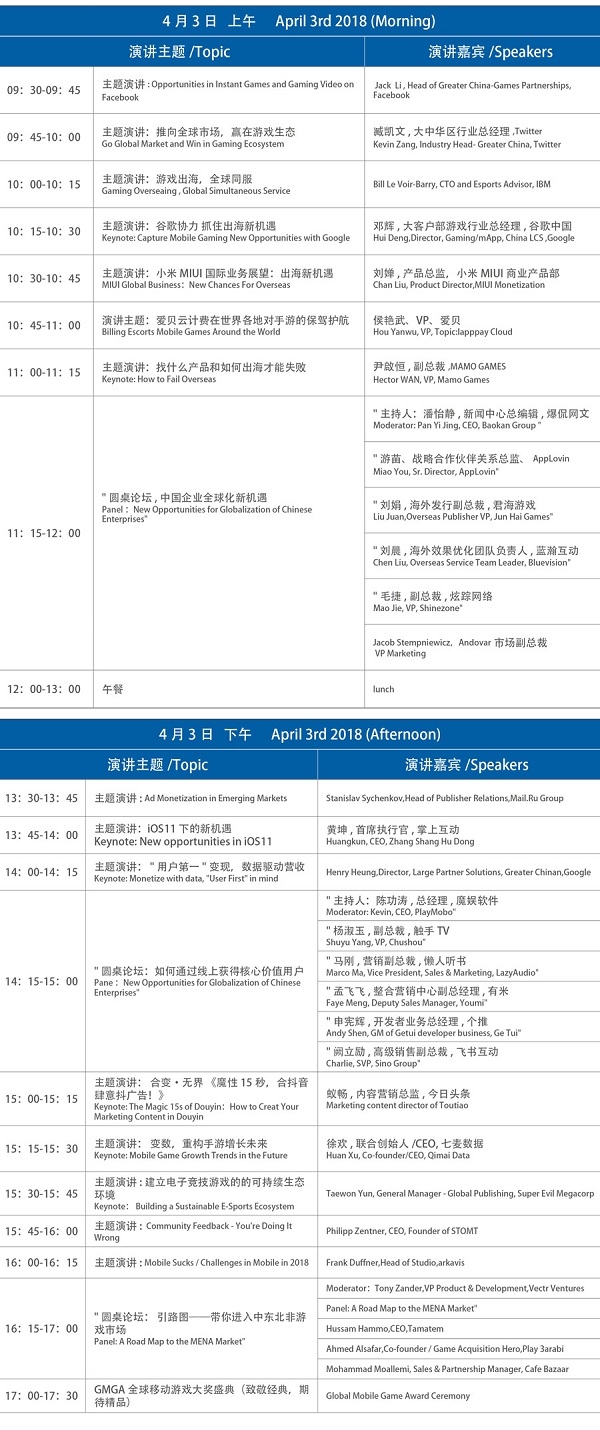 由GMGC主办的第七届全球游戏大会(简称:GMGC北京2018)将于2018年4月2日-3日在中国北京国家会议中心盛大召开,本届大会以“游戏改变世界”为主题。作为亚太地区开年首场游戏大会,GMGC北京2018内容涵盖区块链+游戏,线上C端,信息流广告,游戏联运,ASO运营与技术,GMGA颁奖盛典,独立游戏,游戏出海闭门商务对接,IP对接,中外开发者交流等丰富内容,是广大游戏企业把握全球化市场下的中国机会,改变全球游戏市场格局的首选。 今天是GMGC北京2018大会倒计时10天,主办方正式公布了大会具体议程—— 大会议程总览 主会场首日议程 主会场次日议程 IPA独立游戏开发者大赛 IP对接会议程 ※以上议程仅供参考,请以大会现场为准 报名GMGC北京2018大会: http://gmgc2018.eventdove.com/ GMGC北京2018大会赞助、商务合作请联系: 北京总部:Sunny Tel: 010-67786766 Email: fei.sun@gmgc.info 西南区:Bingo Tel: 028-61152335 Email: cd@gmgc.info 华南区:Ben Tel: 0755-86708532 Email: sz@gmgc.info International Inquiries: Ash Tel: 010-67786766 Email: global@gmgc.info 媒体、市场合作请联系: Iris Tel: 010-67784600 Email: media@gmgc.info |