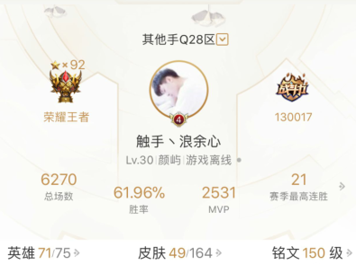 荣耀王者局以上的鲁班的胜率一般是多少?据说不会超过50%。听说高端局里,自己家有鲁班,就先输了一半,而对面有鲁班,则赢了一半,可见坚持鲁班这个英雄作为信仰,需要承受多大的压力。不过浪余心的战绩,大家可以感受一下,万场鲁班,2200把,73.5%的胜率,最高赛季连胜21胜,职业选手用鲁班也未必能打出这个成绩。