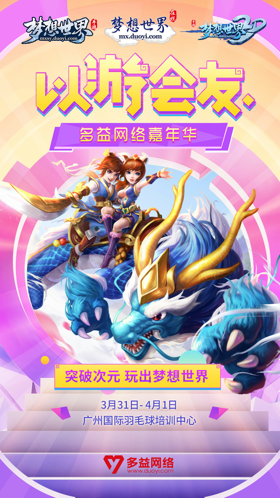 《梦想世界3D》全新内容“骑思妙想”正式开启,飞行坐骑耀世而出踏云追梦,强力新宠闪亮登场助战回合!全新85级新剧情解锁仙裔前尘旧梦,梦想大陆突破等级上限!2018多益网络嘉年华“以游会友”开展线下奇遇,3月31日广州集结,千人狂欢盛典等你围观! 以游会友 千人狂欢 2018多益网络嘉年华即将在广州国际羽毛球培训中心盛大开幕!3月31日-4月1日,千人狂欢“以游会友”,无需购票,零门槛准入的线下盛典不仅有多益网络旗下多款产品的经典游戏场景还原,还有燃爆现场的明星红人精彩表演,此外福利满满的游园盛会必将让你满载而归!想知道更多多益嘉年华现场亮点,线上手绘地图马上曝光给你看! 展区亮点 趣味互动 本次多益网络2018嘉年华中,设置了主舞台、互动展示区、周边兑换区及包含《梦想世界》系列产品在内的多款产品专属区域!豪华明星嘉宾阵容助阵主舞台,经典国风文化充盈游艺街,捏面人、糖画、剪纸、篆刻、人像素描,只有你想不到,没有现场做不到!感受最匠心独运的民间艺术,兑换最称心如意的游戏周边,多益嘉年华等你来临! 突破次元 玩出梦想 以游会友,突破次元,本次多益嘉年华中有包含《梦想世界》在内的多益网络旗下多款经典产品参展!更有知名动漫歌手祈Inory登台演唱《梦想世界》主题曲《梦想明月曲》!此外更有知名古风舞者未央浅笑献舞!当天籁之音突破次元,当元气少女重新演绎经典旋律,当衣裙翩翩守望明月,是否能让你感受到最初曾有过的梦想时光呢!即刻前往官网预约报名,到场签到参与抽奖,还有几率获得神兽哦! 关于《梦想世界3D》手游 《梦想世界3D》手游今日全平台公测开启!招式靠领悟,回合真策略!见招拆招更鲜活,216种招式相生相克尽展极限回合策略。释放想象,海量玩法极具创意,闯迷宫泡温泉惊喜等你来探。碎片收集萌宠进化,宠物养成独具特色。萌娃天降,浪漫社交温情相伴,同城好友推荐,享受真实梦想人生。更有炫酷时装翅膀、搞怪头饰、清凉泳装,独特外观百变搭配任你选! 了解更多相关信息,请前往http://game.yzz.cn/html/info-2292.html |