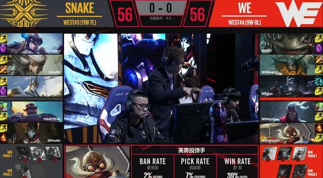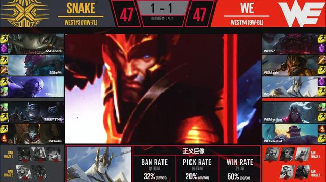 本场比赛SS战队选择了一个中期团战的阵容,而WE战队则选择了一个以皮城女警为中心的前期推进的阵容。WE战队能否顶得住SS战队在前期的攻势,将成为本场比赛的关键点。比赛开始后,双方打得有来有回,但SS战队还是凭借阵容的优势,成功在前期拿到了优势。但WE战队也凭借完美的配合,将局面扳了回来,而且皮城女警也成功把推塔的战术打了出来。比赛进行到22分50秒,人头数SS 8-5 WE,防御塔数SS 1-2 WE,小龙数SS 1-1 WE,经济方面WE战队和SS战队持平,都是38100元。随后双方在中路的一波团战中,SS战队大获全胜。随后双方在大龙处纠缠,WE战队抓住机会直接开团,成功打了波0换4后,WE战队刷掉了大龙!紧接着WE战队利用大龙BUFF三路推进,破掉了SS战队的三路高地水晶后,WE战队直接开团,成功打了波0换3后,WE战队一波带走了SS战队,拿下了本轮系列赛的胜利!恭喜WE战队扳回一城!WE战队的ADC选手Mystic凭借皮城女警的出色发挥,成功帮助队伍拿下本场比赛的胜利后,成功夺得了本场比赛的MVP!恭喜Mystic!