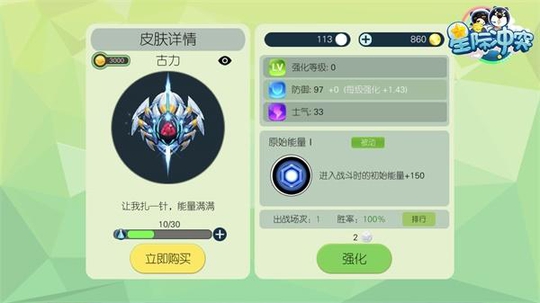 第二站皮肤详情 皮肤属性技能一览无余 前文说过,每个星球皮肤不只是虚有其表,他们的能力各有千秋。想要查看皮肤的详细资料就需要在皮肤界面中,点击某个皮肤即可显示其具体的皮肤详情。强化等级、防御能力、士气指数都会以数据的方式展示,另外,在详情中还能查看每个星球所拥有的独特技能的具体描述。左上角的标志代表着此星球的定位,现阶段定位分为三类,攻击、防御和回复。跟好友开黑时,根据自己选择的位置选择相应的星球皮肤,可以让星球之战赢的更加轻松