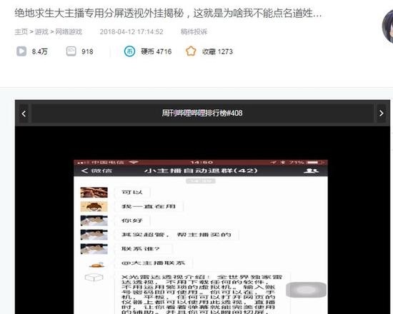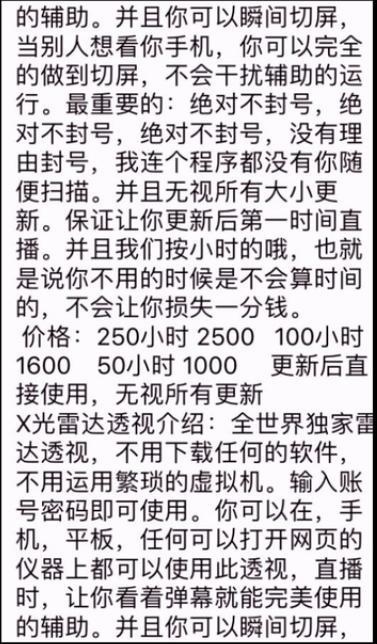 近日B站大佬就揭秘了绝地求生大主播专用分屏透视外挂,号称“绝对不封号”。 不需要任何插件,任何软件装在电脑上,只需要用手机打开一个网页对接上一个服务器,就能达到一个游戏透视的效果,无视大小更新并且保证让你更新后第一时间就能直播。价格差不多10块钱一个小时,看着这些强大的功能,不禁让小编看到了科技力量的强大,有钱真的可以为所欲为。 当进入游戏的的时候辅助就开始工作,手机分屏会自动进入到小地图透视。可以看到出生岛附近的所有人,对于东南西北方向,手机屏幕会跟着你操作自动转向。 当飞机起飞跳伞的时候可以看到哪个地方有人下去,往哪个方向。甚至说那里有M4,那里有AK都可以一目了然。什么饮料,背包,血包拿到你手软,让我再次不禁感慨,有钱真的可以为所欲为。 外挂打破了游戏的平衡,使得不开挂的人游戏体验极差,打击对于外挂有什么看法,欢迎在评论区留下你的意见。 |