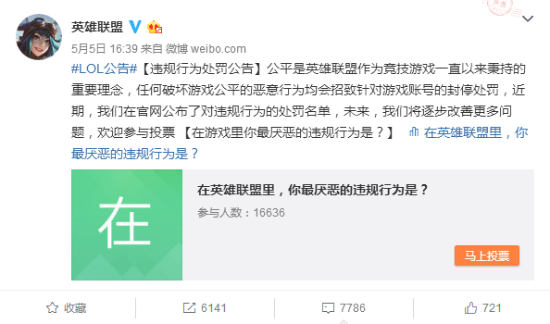 昨日,英雄联盟官方发布了“在游戏里你最厌恶的违规行为是?”投票活动,截至目前,已经有4万多人参与了投票,目前看来最受玩家厌恶的行为就是送人头-消极比赛行为,得票10032,占总票数的22.8%。 投票地址>> 除了送人头之外,在最受玩家厌恶的违规行为中名列前茅的还有挂机和喷人的行为。 英雄联盟官方表示:公平是英雄联盟作为竞技游戏一直以来秉持的重要理念,任何破坏游戏公平的恶意行为均会招致针对游戏账号的封停处罚,近期,我们在官网公布了对违规行为的处罚名单,未来,我们将逐步改善更多问题。 |