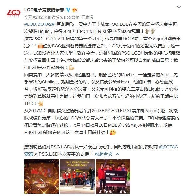 昨天(5月6日)举办的Dota2震中杯XL总决赛中,来自中国的LGD战队与老对手Liquid再次狭路相逢。在决赛前的胜者组比赛中LGD曾经以2:0的比分将Liquid打入败者组,而在总局赛再次遭遇时LGD同样没有手软,最终以3:1的比分拿下Liquid夺得2018年EPICENTER XL震中杯Major冠军。值得一提的是,这次LGD获得的是中国战队的首个Major冠军,可谓是创造了中国Dota圈的历史。 说起LGD获得这次冠军的道路其实并不简单,因为他们一路走来遇到的都是非常强劲的对手。而LGD这次不仅暴打了此前嘲讽中国战队的VP,同时还双杀了“幻神”Liqudi,用实际行动向世界宣布:西恩Dota,Best Dota! 在获得这次具有历史性意义的冠军后,不少电竞圈内人士和Dota玩家都纷纷前往LGD微博下方进行祝贺: 说实话,这次的冠军不仅为LGD一雪前耻,同时也为最近假赛风波缠身而日渐低迷的中国Dota圈注入了一股正能量。希望包括LGD在内的中国队能够再接再厉,获得更多的大赛冠军,重振CNDota的雄风! |