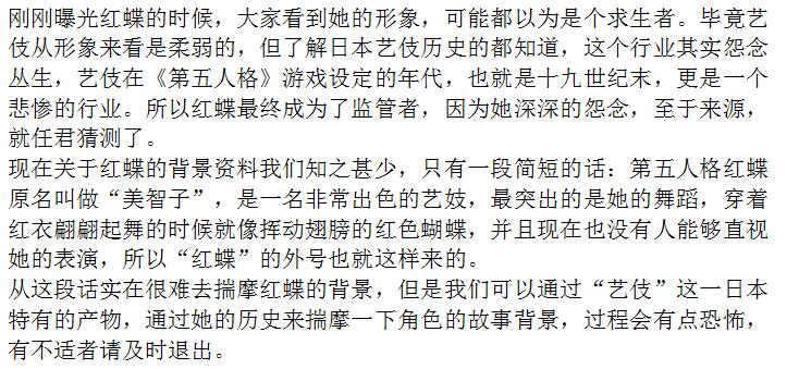 《第五人格》目前的角色还是相对较少的,所以角色更新速度还算快,不过以游戏风格来看,每更新一个角色,带来就是一段悲惨恐怖的故事。 今天我们就来说说,即将更新的角色、也可能是迄今为止背景最恐怖的角色——红蝶美智子。 |