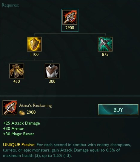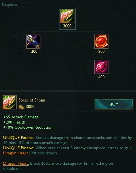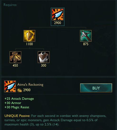 近日有国外网友发现,在此前上古版本中移除的古老装备“阿塔玛之戟"再次回归英雄联盟,接下来让我们一起看看。 Moobeat今天为我们分享了《英雄联盟》测试服8.12版本新装备,大家可以看到熟悉的阿塔玛之戟回归游戏,装备的合成公式变了,现在阿塔玛之戟需要用军团盾+十字镐合成。属性方面,增加25攻击力,30护甲和30魔抗。唯一被动是与英雄,防御塔或者史诗级野怪战斗的时候,获得最大生命0.5%(3级)到2.5%(13级)的伤害。 除了阿塔玛之戟,还有一个全新装备Shojin之矛,这个装备由燃烧宝石和暴风大剑合成,属性方面增加65攻击力,200点生命值和10%的冷却缩减。唯一被动是降低英雄的物理和魔法10点伤害外加15%的额外伤害。唯一被动附近有3名地方英雄时,攻击获得龙之心效果(90秒冷却),6秒内抵挡超过200%的伤害,击杀敌人后刷新。 据官方介绍Shojin之矛是为英雄提供很高的AD输出,又比出防御装强,可在中期团战中存活,很多英雄可以进场高爆发击杀地方英雄,不过自己也会死,这个装备就为英雄提供了那种环境下生存的可能。装备被动激活的范围很小,所以这个对于ADC而言效果不是那么好。 |