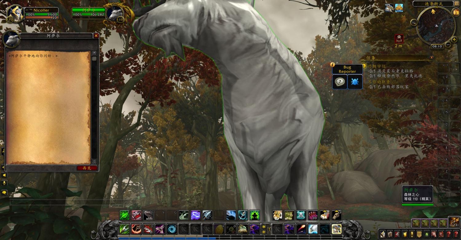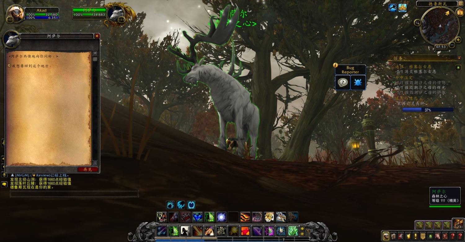 在德鲁斯瓦萧湾镇西南的树林里,有一群群居的鹿,其中有一头体型巨大,自带闪光的鹿叫阿萨尔。根据头目的剧情帖[德鲁斯特的起源]可得知,森林之心阿萨尔是德鲁斯瓦的两位荒野之神之一,被德鲁斯特的棘语者们崇拜和侍奉着。德鲁斯特的高阶棘语者乌法为首的棘语者们后来又教导出了库尔提拉斯人德鲁伊。 如果你是一位德鲁伊玩家,和这头鹿对话,它会热情地向你问好,并且你可以选择把炉石绑在它身上,每次使用炉石时都会传送到这头鹿身旁。 而如果你是一位非德鲁伊玩家,它只会平静地向你问好,并没有绑炉石这个选项。 |