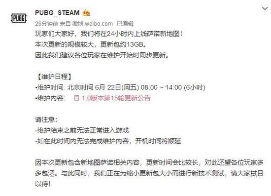 绝地求生在近日更新的测试服中,将新地图SANHOK(以下简称萨诺)的神秘面纱正是揭开,并且一连修复了多个BUG,目前为止大多玩家们,都开始期待正式服将会何时更新,而就在刚刚,绝地求生官微发布了正式服的更新公告,下面赶紧和小编来看看详细情形吧! 维护时间:6月22日早8:00-午14:00,全过程预计6小时。 公告详情: 敲黑板划重点: 1:更新包月13GB; 犹记得上次蓝洞更新了10GB的安装包,就已经引得不少玩家吐槽,表示更新没见多少,内存占据的倒是挺多,莫不是重做游戏了? |