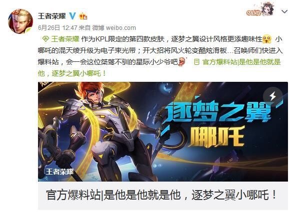 就在昨天,《王者荣耀》官博公布了第四款KPL限定皮肤的消息。正如我们此前爆料所说,这次的KPL新皮肤正是逐梦之翼——哪吒。 从外观上来看,这款皮肤延续了KPL限定皮肤一贯的未来科幻风,混天绫和风火轮也变成了科技感十足的激光束带和滑板。 根据官方表示,在设计这款皮肤时最先考虑到的就是“如何将哪吒的技能与KPL皮肤风格结合”的问题。如果仅仅是做一些金闪闪的电光特效便会显得太没意思,所以就有了哪吒开大招时风火轮可以变形成一个小滑板的设定。有趣的是,这款皮肤还有一句语音彩蛋:“优秀的人,怎会千里送人头!” KPL限定皮肤-逐梦之翼游戏中实战效果如下: 不过相比起之前的KPL限定皮肤,或许是由于官博带头皮了一下的原因,玩家们这次对皮肤的细节并没有过多的讨论,关注点都放在了非常奇怪的地方... 据悉,这款皮肤预计将于本周五(6月29日)开启抢先体验活动,与之前的马可波罗一样,我们可以消耗10点券来进行预购并获得7日体验卡,并且将会根据预购人数来决定登场时的折扣,最低可至6折(532点券)。各位有兴趣的小伙伴千万不要错过啦!(最后不得不吐槽一下,逐梦之翼和何炅老师真的好像...) |