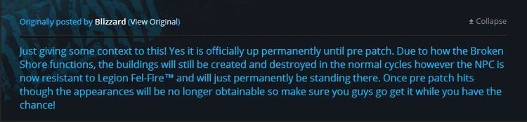 昨日,《魔兽世界》美服官网发布多条蓝贴,多项改动在正式服实装。如无意外,这些内容将在6月28日(本周四)的日常维护后在中国大陆服务器实装。 法师塔保持开放 神器挑战外观在过去只有法师塔激活时候才能获得,这令一部分玩家担心新版本到来前没有足够时间进行挑战。暴雪在之前宣布了会在版本结束前让法师塔一直保持开放状态,而现在这个改动已经实装。 告诉大家一些关于这个的消息!是的,现在它将一直存在,直到前夕的到来。由于破碎海滩的建筑机制,这些建筑依然会被摧毁和重建,但是相关的NPC现在对军团的邪火有抵抗力了,他们会一直站在那里。当前夕版本上线后,挑战外观将不再能够获得,确保你自己在有机会获得它的时候去取得它! 8.0版本开始预下载 战网后台已可以开始预下载一个大小约为16GB的补丁内容,至于这个补丁内容是前夕,抑或是8.0正式服,暂时还不确定。 神器退役任务上线 玩家上线后将会接到“代言人的召唤”这一任务,指引你前往希利苏斯的阵营飞艇上,与其他职业的勇士一起,用手中的神器吸收萨格拉斯之剑的黑暗能量,以此来治疗受伤的艾泽拉斯。 联盟方玩家所见到的NPC为:金刚不坏彭戍(武僧)、考瓦斯·血棘(恶魔猎手)、伦萨·巨蹄(德鲁伊)、高阶祭司伊莎娜(牧师)、大法师瓦格斯(法师)与大领主达里安·莫格莱尼(死亡骑士)。 部落方玩家所见到的NPC为:伊崔格(战士)、莉亚德琳女伯爵(圣骑士)、雷特森·焰怒(术士)、大领主达里安·莫格莱尼(死亡骑士)、瓦莉拉·萨古纳尔(潜行者)和哈杜伦·明翼(猎人)。 完成任务后,你的神器能量将会调整为最大,神器等级变成126级,抗魔联军的调和特质为75级。 在前夕到来之前,神器的特质仍然保持生效。一旦前夕补丁上线,所有特质全部失效,圣物仅用于提升武器的装备等级,神器将彻底变成一把普通武器。 神器能量再次可以被出售 由于神器在完成退役任务后能量达到最大值,因此神器能量也失去了它应有的作用,玩家背包里的神器能量将可以出售给商人换取金币。绝大部分的神器能量售价为25金币,而一些史诗品质的神器能量售价为100金币。 |