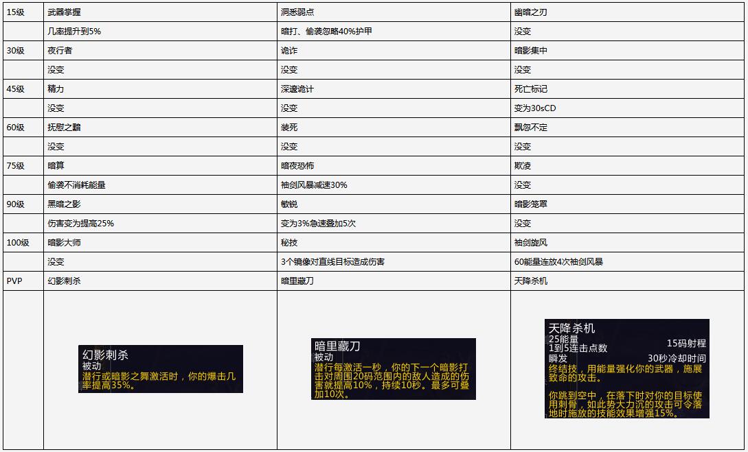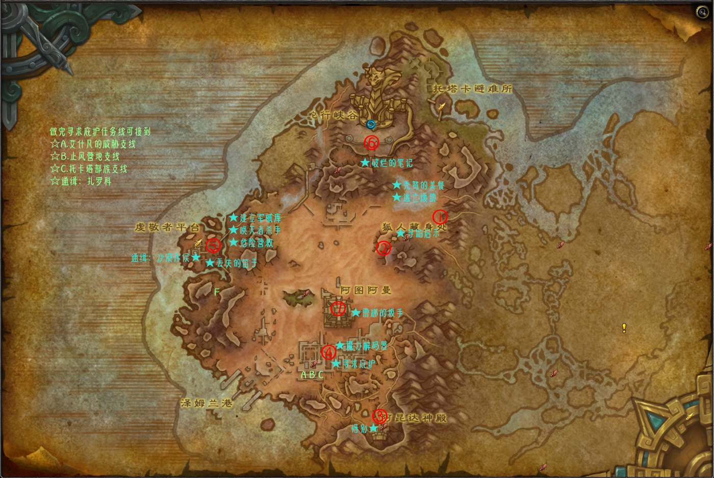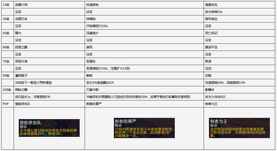 本篇内容送给没有就机会参与测试并且希望在第一时间升满级准备采资源/刷装备/练小号/挂集合石的贼友 战前准备 消耗品 合剂、大餐、延时、嗜血鼓、水上行走药剂(疾跑的时候可以在水上行走)、治疗药水 坐骑 水黾、修理大象、1-2个基友 天赋 ☆单人练级天赋推荐:敏锐 敏锐天赋和LEG时候练级一样,快速暴力,适合solo;一定要点开战争模式,一定要点开战争模式,一定要点开战争模式,因为联盟在另一张图练级。 战争模式是个啥? 第5层随便点,偷袭有星无伤害,袖剑减速不常用,欺凌没以前的藏刀暗打不晕怪只能靠肾击 第6层如果装备好可以点黑暗之影提升所有伤害25,2个剔骨秒怪,测试服装等低我选择3层暗影之舞,不行就开反正次数多CD短 敏锐天赋改动 ☆多人练级天赋推荐:狂徒 首先,剑刃乱舞被改掉了,没有能量回复降低了!!!由于狂徒恢复能力差,适合队友拉仇恨你来A。一定要点开战争模式,一定要点开战争模式,一定要点开战争模式。 剑刃乱舞改成啥? 第1层也可以点武器大师,毕竟我们是大部分时间都开着剑刃乱舞的 第5层随便点,我觉得致盲冷却还挺有用的,但还是喜欢闷棍不消耗能量 狂徒天赋改动 练级必看 ☆经测试在无双倍加成下,只做所有主线任务可以升到116.4级,故而升级过程中需要完成奖励目标或大量支线 ☆个人测试在不完成奖励目标的情况下,完成3地图主线+纳兹米尔支线+沃顿全部即可满级,做奖励目标可放弃沃顿右上方支线 ☆支线任务列表序号说明,例如2-3-1(2表示同步进行中的主线任务,1表示通缉任务或找NPC开启新支线,绿色表示支线任务的顺序) ☆本攻略提供的是详细任务线,将前置找NPC的任务也写在里面,但这写找人任务并不是必须做的 纳兹米尔主线+支线任务,如图 ![]() ☆建议第一个图选纳兹米尔,做完第7步主线后又坐船回到主线1的地方,所以我选择刚开始只撸主线和别人拉开距离,回头再清支线 ☆支线追捕札达克斯需要完成主线3后才能接,但下一步力量的代价根本不需要 ☆支线侍奉卡格瓦需要完成主线6后才能接,下同 沃顿主线+支线任务,如图 ![]() ☆第二张图选沃顿,主线基本都在地图外围,之间相隔较远;支线集中在地图中间,下方和右上。 ☆个人选择做完主线1-4后,不去做主线5而是去完成支线寻求庇护,开始做大量集中的支线任务。 祖达萨主线任务,如图 ![]() 不推荐祖达萨支线,支线任务太过分散,山多、洞多、鸟点多,还经常爬楼坐船。 前置任务 由于还没开前夕,个人感觉幽暗城场景战役前夕就可以完成,所以并没有做,如前夕未上线将补充该视频。 任务列表