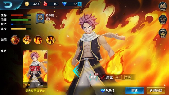 好战,也是纳兹的一大特点。最近有一款 MOBA 手游《小米超神》和《妖精的尾巴》搞了一波深度的联动,将纳兹做成了一个游戏中的英雄并上线了。 动漫的角色,对于 MOBA 类的游戏来说,是非常适合做成英雄角色的。因为动漫角色普遍拥有自己标志性的技能招式,而 MOBA 类游戏,其实玩的也多是技能之间的衔接和配合,对于一些游戏策划来说,根本不用费劲去想什么技能方面的设计,直接照搬就可以了,而且还能体现还原度。 《小米超神》就照搬了纳兹在动漫里的设定,还原方面做的非常好。不只是纳兹的形象,一头樱红色的头发,伊格尼鲁送的围巾等设计,都很好地还原了纳兹这个角色;还有在技能的设计上,火龙的剑角、火龙的肘击、火龙的铁拳、火龙的钩爪以及火龙的咆哮等动漫中纳兹的招数都在游戏中活灵活现地表现了出来。