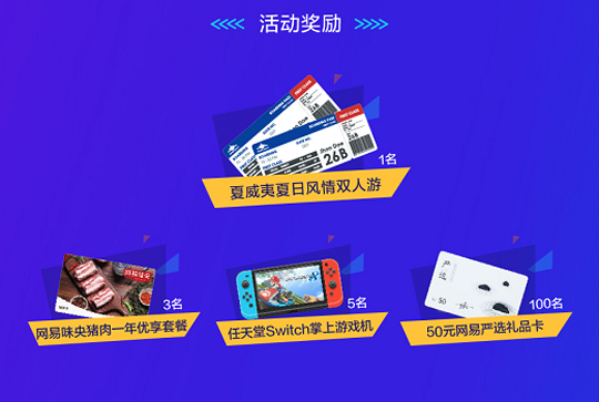 【福利二:分享动态抽大奖 赢夏威夷风情双人游】 7月18日-7月27日,只要在#我要上精选#话题中发布动态,被选入“精选”推荐,即可参与抽奖活动。上精选次数越高,中奖几率越高哦~7月30日,@大神活动管家 将会在#我要上精选#话题精选动态中,随机抽取幸运玩家,送出网易大神官方大奖! 一等奖:夏威夷夏日风情双人游(1名) 二等奖:网易味央猪肉一年优享套餐(3名) 三等奖:任天堂Switch掌上游戏机(5名) 四等奖:50元网易严选礼品卡(100名)