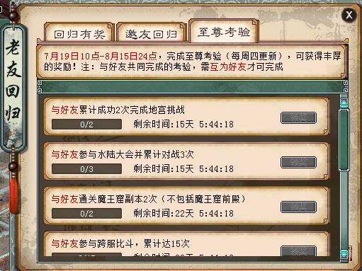 重出江湖好友回流,豪华奖励等你赢取!《大话西游2免费版》2018回流活动“重出江湖”情义来袭,即日起至8月15日,四大福利活动等你参与!邀请好友回流,抽奖赢取年手办、大话邮票纪念册、大话U盘等丰厚奖品。跟回流好友一起做任务下副本,还能获取老友积分,兑换小年口粮、龙之骨、黄宝石、绿宝石等海量奖励! 回流活动所有玩家均可参与,其中2018年6月19日前建角色;6月19日至7月19日期间,登录免费版游戏不足20个小时;等级在1转110级以上玩家;在7月19日至8月1日期间首次上线的14天内,定义为回流玩家,回流玩家可获得翅膀升级券、幻形丹?归等额外福利! 点击专题了解更多活动详情:http://dh2.163.com/huiliu/201807/ 召集战友 赢实物大礼 人物等级≥1转110级的玩家,可发送短信邀请老玩家回归大话。累计成功邀请回第1、3、5位好友,均可获得抽奖资格。8月13日至15日12:00-24:00期间,参与抽奖即有几率获得年手办、大话邮票纪念册、大话U盘等奖励!邀请回流好友越多,中奖几率越大喔! 此外,邀请老玩家回归、与回流玩家组队任务,或当绑定邀请关系的回流玩家获得回归积分时,都可获得老友积分,每日上限100分,可用于兑换小年口粮,还能获得黄宝石、龙之骨等奖励! 再战大话 兑畅玩大奖 侠士发短信拉好友回归时,会收到重出江湖礼包激活码。回流玩家回归后,即可在礼包中心处领取“重出江湖礼包”,可获得翅膀升级券、幻形丹?归、任我行?组队等丰厚奖励。 回流玩家每天上线完成日常任务,获得天道酬勤积分的同时,还将获得同等回归积分。回归积分每天上限180,可兑换小年口粮等奖励!当回归总积分达1200、2400分时,还可参与实物抽奖,有几率获得年手办、大话邮票纪念册、大话U盘等奖励! 重出江湖 享召集特权 回流玩家,在线还能获得重出江湖特权。 称谓特权:活动期间上线,可获得“重出江湖”称谓,还会有特别的“回归”标识。 畅玩特权:每天完成地宫、大雁塔、孤竹城、帮派、师门、天庭、鬼王、修罗任务、合纵连横,将获得额外基础经验加成和师贡奖励! 组队特权:当队伍中存在回流玩家,全体队员在进行小鬼,天庭,鬼王,修罗,雁塔除妖,孤竹城,地宫等任务时将享受奖励加成,队伍中回流玩家越多,奖励越多! 至尊考验 给特别的礼 活动期间,每周将开启2个“至尊考验任务”,任务详情可在“至尊考验”页面查看,每位侠士都可以参与噢。完成任务后,可领取黄宝石、高级古阵残页、八荒遗风、蕴灵珠、聚魄丹、绿宝石等特别奖励! 风云际会江湖聚首,携手同心再现峥嵘!赶快邀请老友回归吧,年手办、大话邮票纪念册、大话U盘等实物奖励将接连送出,更有小年口粮、高级古阵残页、八荒遗风、龙之骨、黄宝石、绿宝石等多重好礼等你来领! 《大话西游2经典版》,亿万口碑扛鼎之作,国风全新版本震撼来袭!官网:http://xy2.163.com/ 《大话西游2免费版》,绿色免费,轻松赚钱,经典再临,夏季资料片《斗转星移》即将上线!官网:http://dh2.163.com/ 《大话西游2口袋版》,满分经典,指尖还原!官网:http://xy2.163.com/koudai/ |