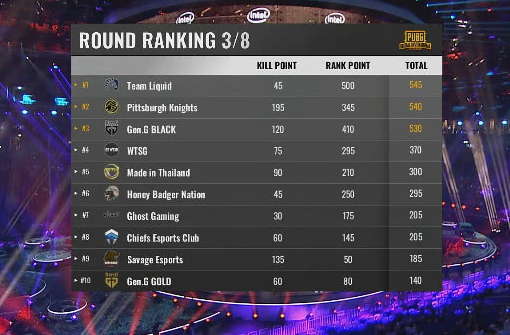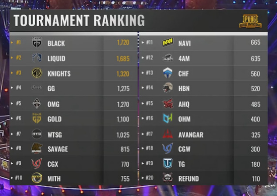 北京时间7月26日,2018年PGI绝地求生全球邀请赛在德国柏林开战,在首个比赛日进行的TPP决赛中,Black凭借连续三把前五的稳定发挥,最终以1720分霸占了榜首位置,而Liquid凭借完美的选点能力吃下两连鸡,最终以1685分排名第二。来自中国的OMG战队在第二局成功吃鸡,以1270分排名第五,4AM则高开低走,以635分排名第12。 2018年PGI绝地求生全球邀请赛是由PUBG Corp举办的首届官方赛事。20支世界顶尖战队齐聚柏林,参与首届绝地求生世界杯,争夺200万美元(约合人民币1350万元)总奖金和绝地求生全球最高荣誉! 为了考验选手们的技术、战略和对胜利的渴望,PGI将进行共计4天的比赛,他们将参加第一人称和第三人称两种模式的比赛,每个模式两天,每天4局比赛,最终比赛的团队积分将基于队伍排行和淘汰数量计算,两个模式的冠军分别由对应模式总积分第一战队获得。其中,4AM和OMG战队将代表中国赛区出战。 中国战队 4AM 4AM今天的表现可谓是高开低走,他们第一把状态神勇以9杀排名第二,但之后却连续三把早早出局,在第四局中更是出现了CPT手雷炸倒Gucun的严重失误,最近仅仅排名12。如果4AM无法及时调整状态,那么他们接下来的比赛将会十分令人担忧。 OMG 虽然OMG在第二局比赛中吃鸡的一幕令人热血沸腾,但他们在此后仍然出现了几次决策失误,所幸的是,他们仍旧处在一个较高的积分席位,如果明天他们能够吸取经验,越战越勇,那么拿到TPP决赛的冠军对OMG而言绝非不可能。 赛后声音 BlACK:“Liquid是我们最大的敌人,他们十分难对付。” OMG.Xiaorong:“最后一局里,虽然我知道Black要打我们,但是我们非常被动,最终没能打好,没能守住那里。” 比赛回顾 第一局:4AM绕后团灭OMG Ghost战队12杀吃鸡 本局航线由左上角的Z镇到右下角的大小电厂。 首个毒圈刷在了地图右下方,4AM和OMG都在拿到交通工具后早早进行转移,Liquid霸占了山头,而HBN在被CGW攻楼后果断弃楼离去。在经过首轮的物资收集后,由于毒圈往右上角切角并有大范围的水域,几乎所有队伍都在第一时间进行转移,OHM分兵接连偷人得手,OMG在WTSG和Knights两队的战局一侧虎视眈眈,而4AM在满编进入小电厂后和Liquid携手灭掉了TG,Ghost则满编灭队Navi。 第二局:4AM围剿不成反被灭 OMG冷静决策终吃鸡 第二局航线由小电厂下方至Z镇。 首个毒圈刷在了学校和P城中间,4AM直接往机场跳伞,OMG则选择飞至P城下方打野发育,TG刚刚落地分兵就被MiTH开车撞死一人,Black则在圣山狙掉远处的GCX一人,HBN继续寻找房区。随着圈往左上切角,转移的各队开始接触交火,WTSG超远距离狙击掉Liquid一人,CHF则偷掉了4AM的Aluka。在战局的另一侧,CPT和Gucun两人想围剿厕所里的WTSG一人,但是因为投掷物的使用失误,竟然被一打二完成反杀,就连在山头架枪的Godv也没能幸免于难,4AM以零击杀止步于17名。 决赛圈刷至小G镇西侧,WTSG和CGX为了抢占山头大打出手,GOLD突然发力干掉了Knights,Liquid遭遇天谴圈只剩下独狼ibiza一名,此时场上剩余九支队伍,二十四个生存。随后,Black和GOLD联手夹击WTSG,WTSG三人阵亡,Liquid的独狼也被GOLD发现干掉,此时满编的OMG冲出房区干掉CGW,又在Navi和GOLD的混战中渔翁得利,将两支队伍尽数灭掉。在比赛最后,OMG四人对抗Black三人,Black强行开车试图拉近战线,但是OMG利用人数优势稳扎稳打,最后在二打一的情况下成功吃鸡。 第三局:中国两队早早出局 Liquid完美选点3杀吃鸡 第三局航线为一条横向直线,由医院到Z港。 首个毒圈刷在了地图右侧,有四成区域为海域。MiTH再次落地找车,成功撞死refund一人并拿到首杀,refund只能被迫冲进TG的领地,排名分列倒数第一第二的两队短兵相接,TG亦被击杀一人。Ghost居高临下占据炮楼,但是MiTH居然选择莽撞强攻Ghost,就连HBN也在一旁对Ghost实施骚扰,Ghost被击杀三人,只剩下一名独狼仓皇逃窜,而CHF和AvG埋伏蹲到Liquid,Liquid被击杀两人后狼狈撤离。随着毒圈继续缩小,大范围的减员开始出现,OMG为了进圈决定强冲Avg,但是Avg凭借枪林弹雨将OMG团灭,OMG只能以零击杀饮恨出局,在战局的另一侧,Ahq和4AM短兵相接,Godv率先阵亡,此时SAVAGE也加入战局,用两颗雷将4AM团灭。 决赛圈刷至伐木场北侧,场上尚有十支队伍,二十四个生存,WTSG将Ghost独狼击杀,而HBN和Knights展开交锋,韩国队伍BLACK先是强攻TG,之后又捡漏干掉了人员不齐WSTG和Knights ,满编的Black似乎马上就要吃鸡,但是Liquid凭借完美选点此刻正在炮楼以逸待劳,他们非常的沉着冷静,队内的配合只能用完美来形容,Black对此招架不及遭到团灭,Liquid完成三杀吃鸡。 第四局:OMG过分保守失好局 Liquid天命圈两连鸡 第四局航线由右上角光明顶飞向机场岛。 第一个毒圈再次收缩在了地图右侧,这对于中国的两支队伍极不友好,Avg强势占据光明顶,CHF则占了养老院发育,HBN在转移过程中和Ghost相遇,Ghost直接将HBN团灭,HBN也成为了第四局里首支出局的队伍。随着毒圈缩小,几乎所有队伍都开始往北转移,OMG被Liquid和MiTH前后夹击,只能躲进厕所避难,而4AM和Knights遭遇,由于4AM没有掩体,Godv率先阵亡,其余三人只能无奈地撤离。此后,refuned也向4AM伸出了魔爪,由于Cpt一时手雷失误把Gucun炸倒,两人尽数阵亡,而仅存的独狼Aluka也在跑圈时倒在安全区外,4AM再次早早出局。 决赛圈刷至地图东北,此时场上八支队伍,二十三个生存,OMG在厕所边上卡主想进圈的BLACK,但是Knights却横插一脚,局面演变成了乱战,最终BLACK团灭OMG。战局另一侧,Liquid又展现