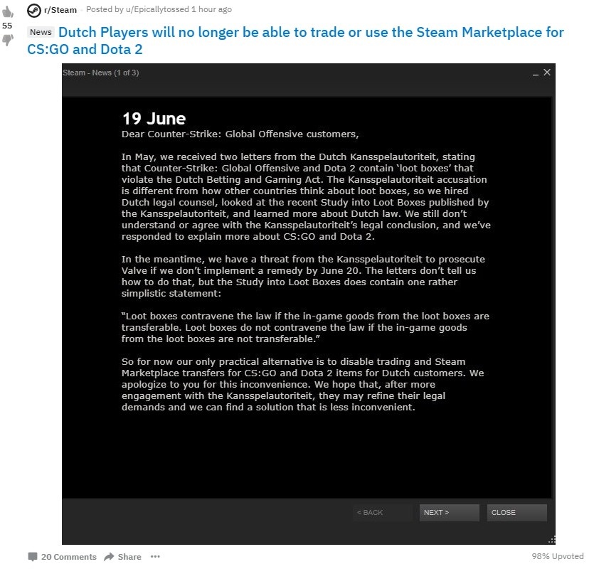近日在reddit论坛上有网友爆料,荷兰玩家在《Dota2》开箱时能提前浏览箱中可能开出的物品,稀有物品也会显示。 今年4月,荷兰游戏监管机构认为《CS:GO》《Dota2》箱子违反了“博彩法案”,并警告V社必须修改相关系统,之后V社禁用了荷兰地区这两款游戏的物品交易以及市场。 现在根据爆料推测,或许V社已经和当地监管机构达成一致。这位网友还称,荷兰地区的玩家不能一次性购买多个箱子,且每打开一个箱子,下一个箱子出现的预览物品就会产生变化。不过退出预览界面再重新进入,箱子的内容是不变的。目前,荷兰的Steam交易市场仍处于关闭状态。 |