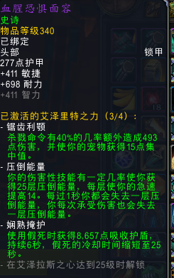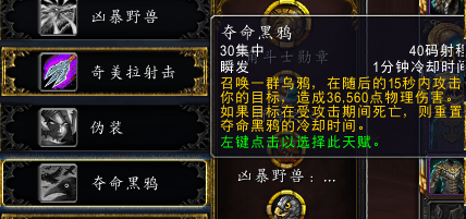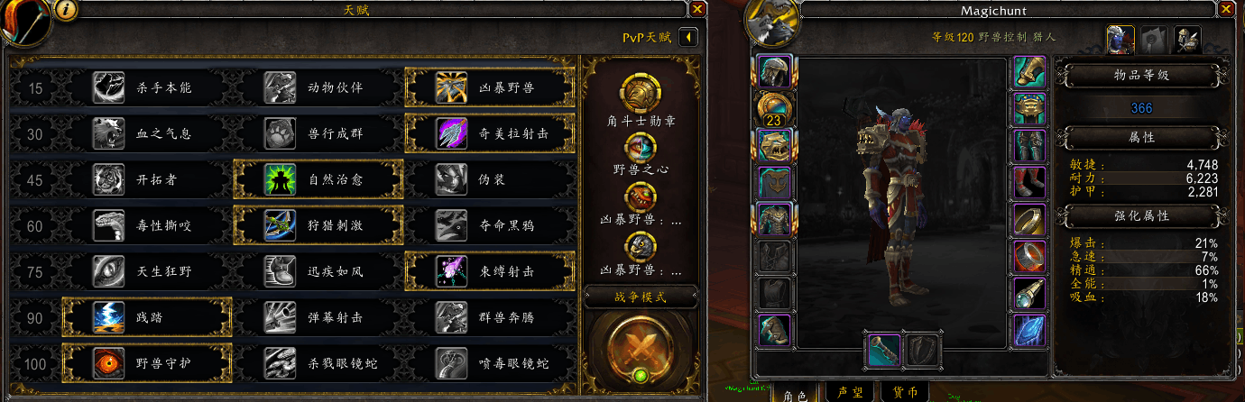 倒刺射击 (替换凶暴野兽) 8秒内造成小额流血伤害 回复20集中值 减少狂野之怒12秒cd 并且使宠物获得30%攻速 可叠加3层。 (技能充能11秒,可储存两次)兽王的核心技能之一 眼镜蛇射击 新增减少杀戮命令cd1秒 2。天赋 1:神器哈提移动第一层天赋 [动物伙伴] 使你额外召唤一只宠物,可使用普通攻击(不受倒刺射击攻速加成) 杀戮命令 天赋[践踏] [野兽顺劈斩] 目前本天赋测试服中会使主要宠物伤害减半,副宠分享主宠的另一半伤害 总体dps提升为不点该天赋的115%左右 喜欢自动档哈提的朋友可以选择。 2: 该天赋可配合红人作为爆发使用 3:第一行另一个为杀戮命令35%血量后造成50%额外天赋,可配合1+1杀戮眼镜蛇使用 可以多触发倒刺射击,保持叠加3层攻速buff 也可以刷新红人cd,1+1天赋必选。野兽守护天赋副选 奇美拉射击可以填充兽王技能cd 也可以回能 在大秘境中aoe和双目标有不错的表现 占比也不错 推荐野兽守护天赋可选择。 这一行天赋中 推荐前期选择狩猎刺激,保持3层的buff为兽王的必修课,有助于直接的提升dps,尤其在团本boss中,3层的倒刺射击buff也是可以直观的拉开不同兽王的dps。 黑鸦适合有少量add处理的boss作为单体爆发,可看情况选择。 后期属性溢出可以考虑眼镜蛇,目前来讲偏弱。 保命天赋 有效缩短兽王的自我恢复。 迅疾如风和束缚箭根据副本需要来选择。 束缚目前是定身效果而不是眩晕!可能会害死近战,高层大米要注意这点。 践踏依然是常驻的主流选择,加强倒刺射击的技能联动,补足兽王倒刺射击的高功能性和低伤害。哈提可继承践踏。 弹幕射击耗能过高,伤害不俗,作为备选,在需要大量aoe的战斗中可以选择。 目前野兽守护加强了宠物[基础攻击] 也就是爪击/拍击/撕咬的伤害30% 而不是普通攻击!这点需要注意! 测试服体现的数据为 宠物基础攻击占比非常高,达到了第一位,所以此天赋前期为必点! 基础攻击可以继承到顺劈斩中。 1+1天赋前期属性不足 能量也不够,表现被野兽守护全面压制。中后期单体boss可选 召唤眼镜蛇。。。目前表现。。。没啥用。 本人的大秘境通用天赋为这套 3。属性 测试服反应的情况来看,主属性敏捷依然是最为主要的属性,但是兽王猎人经过几位大佬的测评集体表示 暴击20-23左右为较为合适的数值 暴击达标后 精通>敏捷=暴击>急速=全能 所以在装备的选择上,装等差10-15装等都可以优先选择暴击精通的装备而不用特意考虑敏捷。 34点精通提升1%宠物伤害 宠物伤害占比70+ 72点暴击提升1%暴击几率 68急速提升1%急速 85全能提升1%总伤害 4。装备特质 特质分为 外圈0 职业特质 中圈 通用特质(提升主副属性) 内圈 保命特质 天命圈 +5装等 需要神器项链的不同等级。 外圈 推荐的优秀特质 [怒火升腾]红人期间提升爆发 [领导兽群]提升占比最高的宠物基础攻击伤害 这两个为测下来最为优秀的,可根据自己天赋搭配,如若为野兽守护流派,可选择3个领导兽群 叠加特质。 如果为红人1+1/红人配守护爆发天赋,可选择怒火升腾+领导兽群/3怒火升腾纯1+1爆发 中圈 推荐的特质为 [不稳定烈焰] 获得139暴击等级 可叠加5层 持续5秒 覆盖全程50-75 兽王技能多,打得快 叠的几率高 你懂的 [大地链接]提升主属性 简单粗暴 被看了无数刀 依然可以选择。 [常驻精通+吸血] 兽王也不错 [元素回旋]触发看脸 很玄学 嗯。没得选你就试试看。 [其他] 其他?你可以试试看 反正我不带。。。 内圈 喜欢什么点什么 天命圈 赶紧肝项链才能到天命圈啊兄弟! 目前想到的就这么多 慢慢再修正。祝各位兽王新版本好运!一次就出核心特质! 哦对了 特质装只能在5m本中尾王掉落,无法战火泰坦!还有团本boss掉落。只有低保开出来的特质装可以是战火/泰坦!低保随机开出1-3件装备(目前测试服)欧皇们祝好运! 5。输出手法 1。单体 野兽守护,尽可能保持自己的宠物攻速buff[狂热]覆盖,即合理利用倒刺射击的两次储备充能机制,在有两层充能的时候可根据狂热的剩余时间快速用掉一层,最佳时间狂热时间过半后使用。 若狂热已达到3层且时间过半,倒刺射击有最高优先权来刷新3层buff。切勿使用其他技能浪费刷新时间。 红人状态下输出手法 凶暴野兽/黑鸦(若都没有可无视)+绿叶+凶暴野兽+杀戮命令+倒刺射击+眼镜蛇射击+眼镜蛇射击+杀戮命令/奇美拉射击+眼镜蛇+倒刺。其中除去起手阶段,可根据狂热的剩余时间来补倒刺射击。(小技巧,如果遇到3层buff即将过半断档,倒刺射击没有冷却 在此可稍等一个共cd的技能时间,如果刷新了倒刺射击立即打掉补充时间,若没有则重新等待2层充能来叠加3层狂热buff。) 单体 杀戮眼镜蛇 此天赋与上版本差别不大,主要在于没有橙装特效,而且红人与绿叶皆有公共cd 所以1+1天赋输出的重点在于更高的覆盖红人,在红人即将冷却完毕前更好的保持高能量打出更多的1+1组合。 2.aoe 野兽守护 在此天赋的非爆发时间段,尽可能的保持覆盖3层狂热,野兽顺劈斩,即可达到较高的持续aoe。基本手法 多重射击+倒刺射击+凶暴野兽/奇美拉+多重射击+杀戮命令/弹幕射击/兽群奔腾+多重射击(需根据能量)(小贴士 在能量不足的情况下只要保持多重的顺劈斩buff和狂热,其他技能可不打留能量来覆盖buff) 爆发aoe 红人因为有共cd,所以是爆发为多重+(群兽奔腾)/红人+倒刺+多重+凶兽/奇美拉/杀戮/弹幕+多重+倒刺射击。绿叶根据自己的boss战时间来开,小怪不用