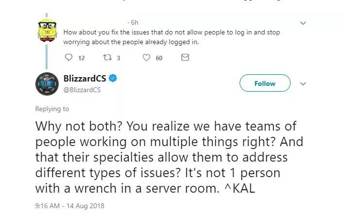 《魔兽世界:争霸艾泽拉斯》现已全球同步上线测试!由于刚上线,暴雪的客服团队每天都要面对着没完没了的投诉,终于有一位客服忍不住爆发了。 近日,暴雪北美客服官推发送了一条关于《魔兽争霸》中新神器艾泽拉斯之心无法获得的BUG反馈公告之后,有玩家就评论道:“你们怎么不修复一下无法登陆的BUG呢?比起已经进游戏玩的人,还是先管管不能登录的吧!” 客服官推在看到这条评论之后,回复道:“为什么不两者兼顾呢?您知道我们有不同的团队为不同的项目而工作吗?知道他们的专长使得他们能够解决不同类型的问题吗?并不是整个服务器机房里只有一个人拿着扳手在那修理哦。” 很少能见到大游戏商家的客服如此“直抒胸臆”的。外媒Kotaku评价说在推特上和人打交道就像赤身裸体走在冰雹中一样难受,所以客服团队这样讥讽的语气回复,也不失为一种方式。 |