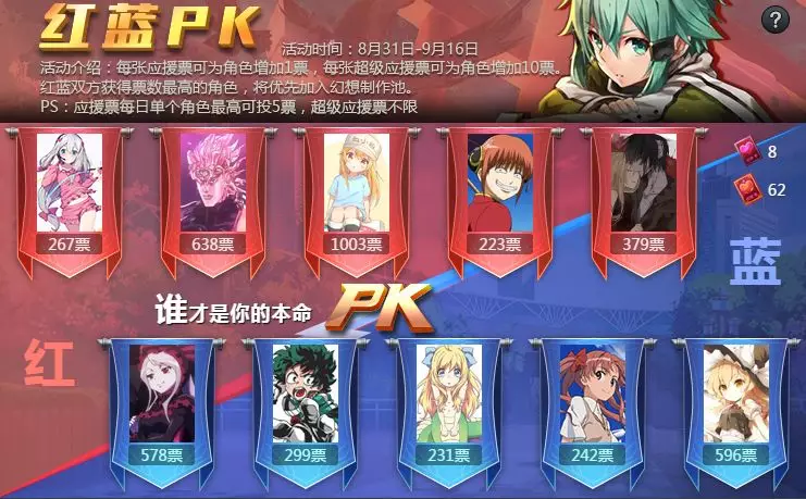 《幻想全明星》红蓝PK第三期也如期而至!本次红蓝PK在延续上期的“DIO”、“和泉纱雾”、“夏提雅”、“白井黑子”外,还添加了新的六位有力竞争对手,快来和幻酱一起看看吧! 点击任意角色头像,即可参与投票 一、血小板,出自动漫《工作细胞》 那个,那个,前方禁止通行呦~ 二、扎克,出自动漫《杀戮天使》 我对神祈誓,会杀了你! 所以不要让我成为骗子! 三、神乐,出自动漫《银魂》 我是风~自由的风! 四、雾雨魔理沙,出自《东方project》 da☆ze 五、绿谷出久,出自动漫《我的英雄学院》 就算没有个性,我也要成为英雄! 六、小邪神,出自动漫《邪神与厨二病少女》 弱小、可爱、还贼能吃! 想要了解和希望看到更多其他相关活动欢迎订阅幻想全明星微信公众号! 全球独有10v10和200人枪战求生的二次元动漫大乱斗端游《幻想全明星》已经正式开启傲娇测试!现在注册登陆还送15英雄10款皮肤10000金币!《幻想全明星》更有枪战求生、玩家自制人族无敌地图现已正式上线,满足你所有需求,现在各种二次元萌妹子陪你一起打游戏,心动不如行动,快来《幻想全明星》享受这独一无二的浪漫约会吧! 了解更多请前往:http://www.acmoba.com/download.html?from=xinwen 了解更多相关信息,请前往http://game.yzz.cn/html/info-2374.html |