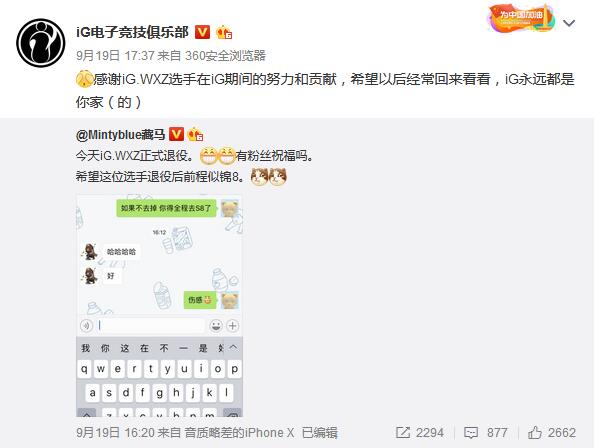 为避免随队参加S8 传奇选手iG.WXZ正式退役