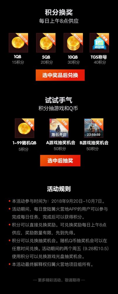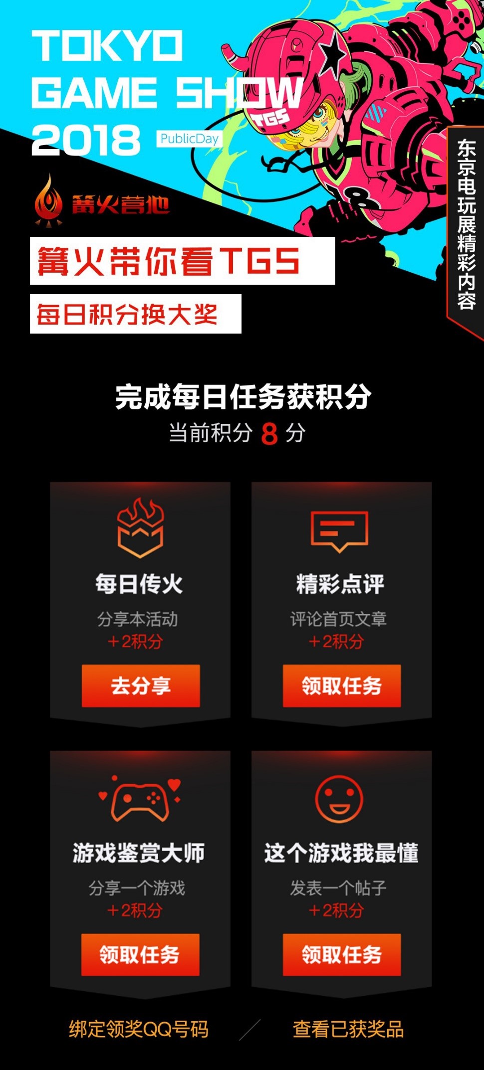 等、登、噔——万众瞩目的TGS 2018东京电玩展(Tokyo Game Show,简称TGS) 即将于9月20日本周四闪亮登场! 没时间去现场? 日本台风导致机票暴涨? 20~21日是厂商日,作为玩家的你只能望“展”兴叹? 不如关注篝火营地的东京电玩展专题活动! 游戏圈的各大展会,历来都是厂商的兵家必争之地:新作品、新设备的发布、试玩,重点季度计划,发售时间公布……等等内容让玩家们翘首以盼,其中不乏一些令你心心念念已久的大作信息;或者期待在展会期间掌握行业的一手动态,在第一时间和身边的硬核玩家小伙伴们分享自己对游戏的独到见解。 而在纷乱繁杂的互联网上,消息来源分散在各个门户网站、游戏媒体上,甚至以往很多重点爆料完全是靠玩家口口相传;到头来,这些消息都要玩家们自行整理统一消化,抑或只能无奈地等到展会结束后,才会出现比较集中的整合复盘资讯。而以往的消息形式通常以冷冰冰的文字和图片为主,这怎么能够有身其境的体验呢? 更何况独乐乐不如众乐乐:谁不羡慕2015年时E3上《最终幻想7》、《莎木3》发布时现场玩家相拥而泣的氛围,谁不想要在众人面前给自己喜欢的游戏用力打call呢。 如今,一切都有了最优解决方案:篝火营地将在9月20日~10月7日期间强势开启东京电玩展专题活动。最官方的前线记者“战报”,最权威的游戏大神主播直播带秀,最专业的TGS预热编辑好文,最硬核的游戏玩家讨论交流、分享心情——更有福利活动壕礼大放送!数不清的隐藏彩蛋,等着你来《篝火营地》APP发掘! 全球游戏展,篝火带你看 9月20日、9月21日,在虎牙直播间:845356,跟随多边形、女王盐、VV 3位游戏大神主播的脚步,现场直播观看本届TGS东京电玩展盛况,第一时间将所有精彩内容尽收眼底!参与互动活动还有机会获得全年免费 3A 大作和 NintendoSwitch 哦~ 篝火独家福利,Q币、游戏领到手软 9月20日~10月7日期间,参与篝火营地APP每日传火、好文共赏、精彩点评等福利活动,足不出户只要动动手指,就有机会赢取单机游戏、海量QB,大佬们,还不快上车? 4个每日任务,需要从篝火营地APP进入活动页,全部完成每日即可获得7积分。每日任务以分享为主,都相对较为轻松,每天动动手指,积分就轻松到手啦! 任务简介: 1. 每日传火:分享本活动。 这等好事岂能不与基友共享? 2. 精彩点评:评论首页文章。 真知灼见总是在思想的碰撞中诞生。 3. 游戏鉴赏大师:分享一个游戏。 买游戏前,不如问问朋友这手剁得值不值? 4. 这个游戏我最懂:发表游梗内容。 懂我的梗的人才算真正的老司机! 活动参与时间共计18日,每日完成全部任务最多可以获得18*7=126积分,至少也可以领取40QB,最多嘛……少年,不搏一搏吗? 本届TGS看什么? 东京游戏电玩展(Tokyo Game Show) 始办于 1996 年,是全球第二大游戏展会,现已经发展成为亚洲最大的游戏展览会。本届东京电玩展的主题为『全新的舞台,开幕』( 新たなステージ、開幕。),并将推出全新风格的展台,以及直播、舞台活动、新的乐趣、新的技术和新的玩法。 重点参展游戏信息 索尼:众星云集 宫崎英高操刀的啊“魂”系列精神续作《只狼》领衔,《往日不再》、《大众高尔夫VR》等 卡普空:冷饭真香 《生化危机2:重制版》、《鬼泣5》、《洛克人11》、《街霸30周年纪念合集》等 万代南梦宫:次元壁,破碎 《荒野的寿飞行队》、《JUMP大乱斗》等 世嘉株式会社:自研+合作矩阵 《审判之眼:死神的遗言》、《赞歌》、《战地5》、《杀手2》、《莎木I&II》等 SQUARE ENIX:久别重逢 《王国之心3》、《勇者斗恶龙建造者2》、《古墓丽影:暗影》 还有…… 微软、科乐美、甚至连与TGS主办方CESA 渊源颇深(咳咳)的任天堂都将携新作参展,据悉,在22~23日的玩家公开日中,TGS还会举办《铁拳7》、《龙珠Z》、《FIFA19》等游戏的线下电竞比赛。 篝火营地:三大展全收集达成 篝火营地APP在今年夏天的E3展会期间惊艳亮相。为了更完整的报道本次E3的空前盛况,篝火营地特别打造了“全景看E3”页面,让网络朝圣也能如临其境,得到了玩家们和业界的一致好评,顺利完成成就:横空出世。 而在紧随而来的科隆游戏展期间,篝火将展会专题活动进一步升级,携手大神主播多边形&女王盐,与虎牙直播合作创建独家专属直播间,连续5天不间断直播科隆展现场,看完展会,主播还会带你进行纽堡林一日游,零距离感受德国风土人情,自此,篝火营地就被硬核玩家们打上了“展会专业户”的荣誉标签。 而在紧接下来的TGS后,敬请各位玩家期待明年来自篝火营地更多、更丰富、更惊艳的展会专题活动! 关于篝火营地:凝聚核心玩家 传承游戏之火 篝火营地囊括了深度游戏内容+最全游戏库+硬核玩家社区+游戏行业热点跟踪,立志打造最专业的游戏硬核玩家资讯APP。 篝火营地现已与多家国内专业游戏媒体达成优质内容的合作,并且建立了收纳9000余款游戏的超大游戏库供玩家任意使用。在本届TGS活动期间,玩家们可以通过搜索随时将展会上看到的种草游戏在库中收藏;或者在每篇编辑推荐的优质文章底部直接就会显示文中提到的相关游戏,是不是非常方便呢? “篝火营地“应用获取方式 IOS用户可以直接在App Store中搜索”篝火营地“进行下载,而Android用户则可以前往各大应用商店搜索”篝火营地“并下载。2018年的三大展就剩东京电玩展了,错过了这次机会就只能再等一年咯。少年快上车,别怪我没有提醒你~