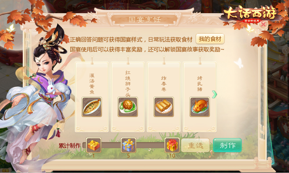 烟花漫长安,国宴飨宾客。《大话西游》手游国庆活动将于明日正式开启,收集食材烹饪特色国宴,烟花盛典迎接金犬福利,“四海升平”、“阅兵演武”、“星君下凡”玩法也将一并火爆来袭,更有海量经验、神兽丹、宝石、五色石等惊喜好礼为你呈上!这个国庆假期,就让大话陪你一起欢度吧! 国宴烹饪,制作美食赢福利 祖国华诞至,烹饪一桌丰盛的国宴庆祝一下吧! 9月30日起至10月7日期间,35级以上的玩家可在NPC长安酒店老板处领取“国宴烹饪”任务,从各式国宴名菜之中选择一种风格的菜肴作为自己的制作目标。 选择完菜系之后,玩家还需先回答一个趣味问题才能开始制作国宴。玩家可通过日常任务搜集食材进行制作。值得一提的是,食材配料可以相互之间进行赠送,和好兄弟们一起交换食材,合力烹饪一桌美味国宴吧! 另一方面,玩家每完成一份国宴,就会解锁一段关于这道菜的故事,解锁故事还有机会获得包括神兽丹、宝石、五色石等珍稀物品在内的奖励,绝对不可错过哦! 烟花盛典,金犬送福贺国诞 盛大的庆典,自然少不了绚烂的烟花为节日添彩。在10月1日当晚19:40,长安城内将举行烟火盛典庆祝节日。在这期间,所有在长安城的玩家每10秒就会获得一次经验奖励和物品奖励,更有神兽、宝石、神兽丹等惊喜礼品在等待着你!此外,烟花盛典过程中还将限时开启金犬送福活动,玩家可在任意场景中领取福利,愿鸡驴大神眷顾! 欢度国庆,五大活动精彩上线 除了“国宴烹饪”与“烟花盛典”活动之外,大话还在国庆期间为玩家们准备了“阅兵演武”、“四海升平”和“星君下凡”活动。届时,玩家们不仅可以在“阅兵演武”中体验全新升级的大闹天宫玩法,感受更激烈畅快的战场厮杀,还可以与兄弟组队挑战“四海生平”任务,赢取宝石、神兵、聚魂丹、五色石等惊喜好礼。此外,“星君下凡”活动也将开启,身着华丽时装的地煞星必定身手不凡,打败他们获得神兽丹、宝石、神兵等特别奖励哦! 缤纷国庆,精彩纷呈。《大话西游》手游国庆活动明日正式开启,五大国庆主题活动共贺华诞,多重好礼任你赢取,各位少侠们,快来大话西游畅享国庆假期吧!更多游戏、赛事信息,请关注《大话西游》手游官网、官方论坛。 与此同时,下载网易大神APP,关注@大话西游手游,每天参与抢评活动,前50名必得价值50元超值大礼包! 网易大神官网: http://ds.163.com/ 了解更多相关信息,请前往http://xy2.yzz.cn/sy/ |