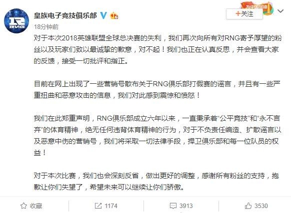 RNG战队官方称假赛传闻属谣言 将会深刻反思