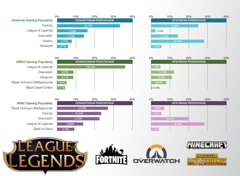数据可视化机构MakeDataShine近日公布了全球网络游戏流量份额 Top 10,这个榜单的排名可能会让不少玩家意想不到。 从数据上来看《英雄联盟》以 26.42%的流量占比排第一,不少人认为已经凉凉的《守望先锋》占据第三。而十余年历史的老游戏《魔兽世界》仍然坚挺在榜单上。 排名详情: 《英雄联盟》 26.42% 《堡垒之夜》 14.85% 《守望先锋》 12.05% 《我的世界》 7.01% 《绝地求生:大逃杀》 6.02% 《命运》 4.56% 《魔兽世界》 3.27% 《星际战甲》 2.91% 《黑色沙漠OL》 2.57% 《部落冲突》 2.40% 美洲地区最受欢迎游戏:《堡垒之夜》、《英雄联盟》、《守望先锋》、《命运》、《我的世界》 EMEA地区(欧洲、中东、非洲)最受欢迎游戏:《英雄联盟》、《守望先锋》、《我的世界》、《绝地求生:大逃杀》、《黑色沙漠OL》 亚太地区最受欢迎游戏:《绝地求生:大逃杀》、《堡垒之夜》、《守望先锋》、《英雄联盟》、《部落冲突》 另外MakeDataShine还表示除了上述各地区最受欢迎的前五名游戏,在美洲地区《火箭联盟》和《GTA5》也很受欢迎,欧洲地区则是《CS:起源》和《CS:GO》,亚太地区是《战争机器人》和《精灵宝可梦Go》。 |