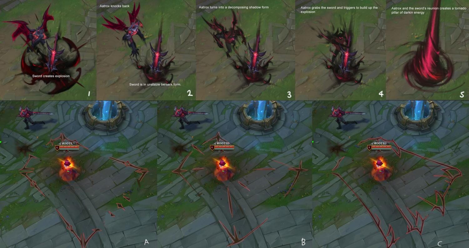 可以看到,正式登场新版剑魔其实摒弃了不少设计过程中的概念,如W技能特效其实就有不小的出入。相对而言,概念图中有不少设计还是非常优秀的,让这位远古战神带来了极强的压迫力。